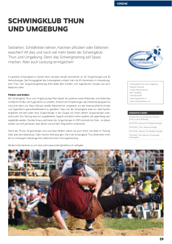 Der Schwingklub Thun und Umgebung legt Wert darauf, ein positives sowie förderndes und forderndes Umfeld für Kinder und Jugendliche zu schaffen. Anhand von Empfehlungen des Präventionsprogramms «cool and clean» von Swiss Olympic werden Massnahmen umgesetzt, um das Vereinsumfeld für Kinder und Jugendliche gesundheitsfördernd zu gestalten. Dazu hat der Schwingklub etwa ein Götti-System eingeführt, bei dem jeder neue Jungschwinger in der Gruppe von einem älteren Jungschwinger unter- stützt wird. Das Training wird von ausgebildeten Jugend-und-Sport-Leitern geleitet, die regelmässig wei- tergebildet werden. Darüber hinaus zeichneten die Jungschwinger im 2021 erstmals ihre Ziele – an diesen werden sie nicht gemessen, aber abholt und auf dem Weg dorthin unterstützt!