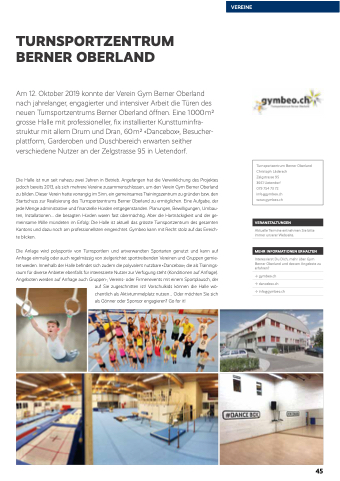 Am 12. Oktober 2019 konnte der Verein Gym Berner Oberland nach jahrelanger, engagierter und intensiver Arbeit die Türen des neuen Turnsportzentrums Berner Oberland öffnen. Eine 1 000 m2 grosse Halle mit professioneller, fix installierter Kunstturninfra- struktur mit allem Drum und Dran, 60 m2 «Dancebox», Besucher- plattform, Garderoben und Duschbereich erwarten seither verschiedene Nutzer an der Zelgstrasse 95 in Uetendorf.