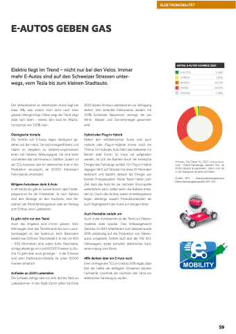 Auch das Angebot wird immer grösser. Vom Kleinwagen über das Familienauto bis zum Luxus- Sportwagen ist das Spektrum breit. Besonders beliebt war 2019 der Tesla Model 3. Er hat mit 400 – 600 Kilometern eine relativ hohe Reichweite, schlägt allerdings mit rund 60 000 Franken zu Bu- che. Es geht aber auch günstiger – in der Schweiz sind zehn Elektroauto-Modelle für unter 35 000 Franken erhältlich.
