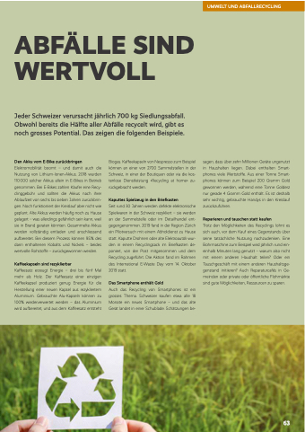Trotz den Möglichkeiten des Recyclings lohnt es sich auch, vor dem Kauf eines Gegenstands über seine tatsächliche Nutzung nachzudenken. Eine Bohrmaschine zum Beispiel wird jährlich rund ein- einhalb Minuten lang genutzt – warum also nicht mit einem anderen Haushalt teilen? Oder ein Tauschgeschäft mit einem anderen Haushaltsge- genstand initiieren? Auch Reparaturcafés in Ge- meinden oder private oder öffentliche Flohmärkte sind gute Möglichkeiten, Ressourcen zu sparen.
