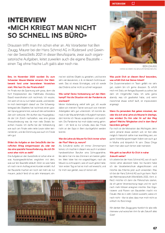 Draussen trifft man ihn schon eher an. Als Vorarbeiter hat Ben Zaugg, Maurer bei der Hans Schmid AG in Rüderswil und Gewin- ner der SwissSkills 2021 in dieser Berufssparte, zwar auch organi- satorische Aufgaben, leitet zuweilen auch die eigene Baustelle – einen Tag ohne frische Luft gab’s aber noch nie.