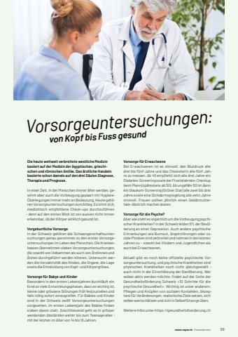 meine-region.ch meine-region.ch Themenberichte 991Vorsorgeuntersuchungen: von Kopf bis Fuss gesundDie heute weltweit verbreitete westliche Medizin basiert auf der Medizin der %u00e4gyptischen, griechischen und r%u00f6mischen Antike. Das %u00e4rztliche Handeln basierte schon damals auf den drei S%u00e4ulen Diagnose, Therapie und Prognose. In einer Zeit, in der Menschen immer %u00e4lter werden, gewinnt aber auch die Vorbeugung gepaart mit Hygiene%u00dcberlegungen immer mehr an Bedeutung. Heute geh%u00f6ren Vorsorgeuntersuchungen zum Alltag. Es lohnt sich, medizinisch empfohlene Check-ups durchzuf%u00fchren %u2013 denn auf den ersten Blick ist von aussen nicht immer erkennbar, ob der K%u00f6rper wirklich gesund ist.Vorgeburtliche VorsorgeIn der Schweiz geh%u00f6ren die Schwangerschaftsuntersuchungen genau genommen zu den ersten Vorsorgeuntersuchungen im Leben des Menschen. Die Krankenkassen %u00fcbernehmen sieben Vorsorgeuntersuchungen, die sowohl von Hebammen als auch von %u00c4rztinnen und %u00c4rzten durchgef%u00fchrt werden k%u00f6nnen. Untersucht werden die Herzaktivit%u00e4t des Kindes, die Organe, die Lage sowie die Entwicklung von Kopf- und K%u00f6rpergr%u00f6sse.Vorsorge f%u00fcr Babys und KinderBesonders in den ersten Lebensjahren durchl%u00e4uft ein Kind so viele Entwicklungsphasen, dass es wichtig ist, kleine oder gr%u00f6ssere St%u00f6rungen fr%u00fch festzustellen und falls n%u00f6tig sofort einzugreifen. F%u00fcr Babies und Kinder sind in der Schweiz zw%u00f6lf Vorsorgeuntersuchungen vorgesehen. Im ersten Lebensjahr des Babies fi nden sieben davon statt. Anschliessend geht es in gr%u00f6sser werdenden Abst%u00e4nden weiter bis zum Teenageralter %u2013 mit der letzten im Alter von 14 bis 16 Jahren. Vorsorge f%u00fcr ErwachseneBei Erwachsenen ist es sinnvoll, den Blutdruck alle drei bis f%u00fcnf Jahre und das Cholesterin alle f%u00fcnf Jahre zu messen. Ab 45 empfi ehlt sich alle drei Jahre ein Diabetes-Screening sowie der Prostatakrebs-Checkup beim Mann (sp%u00e4testens ab 50). Ab ungef%u00e4hr 50 ist dann ein Glaukom-Screening (Gr%u00fcner Star) alle zwei bis drei Jahre sowie eine Dickdarmspiegelung alle zehn Jahre sinnvoll. Frauen sollten j%u00e4hrlich einen Geb%u00e4rmutterhals-Abstrich machen lassen. Vorsorge f%u00fcr die Psyche?Aber wie steht es eigentlich um die Vorbeugung psychischer Krankheiten? In der Schweiz leiden 9% der Bev%u00f6lkerung an einer Depression. Auch andere psychische Erkrankungen wie Burnout, Angstst%u00f6rungen oder soziale Phobien sind verbreitet und nahmen in den letzten Jahren zu %u2013 sowohl bei Kindern und Jugendlichen als auch bei Erwachsenen. Aktuell gibt es noch keine offi zielle psychische Vorsorgeuntersuchung, und psychische Krankheiten sind physischen Krankheiten noch nicht gleichgestellt %u2013 auch nicht in der Einsch%u00e4tzung der Bev%u00f6lkerung. Wer selber aktiv werden m%u00f6chte, fi ndet auf der Seite der Gesundheitsf%u00f6rderung Schweiz %u00ab10 Schritte f%u00fcr die psychische Gesundheit%u00bb. Wichtig ist unter anderem:Pfl egen und Kn%u00fcpfen von sozialen Kontakten, Akzeptanz f%u00fcr Ver%u00e4nderungen, realistische Ziele setzen, sich selber wertsch%u00e4tzen und sich in Selbstf%u00fcrsorge %u00fcben. Weitere Infos unter https://gesundheitsfoerderung.ch
