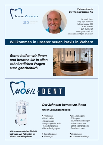 100 meine-region.ch ThemenberichteWillkommen in unserer neuen Praxis in WabernGerne helfen wir Ihnenund beraten Sie in allenzahn%u00e4rztlichen Fragen -auch ganzheitlichZahnarztpraxis Dr. Thomas Orsanic AGDr. med. dent.eidg. dipl. ZahnarztSeftigenstrasse 3583084 WabernT 031 361 62 61www.gzm-orsanic.chzahnarztpraxis@gzm-orsanic.chUnser Leistungsangebot:%u25cf Prothesen:- Druckstellen- Reparaturen- ungen%u00fcgender Halt- Sofortimplantate- Neuanfertigungen%u25cf Dentalhygiene%u25cf PlanungenMit unserer mobilen Einheitbetreuen wir Patienten imAlters- und PflegeheimDer Zahnarzt kommt zu Ihnen%u25cf Bei Schmerzen:- F%u00fcllungen- Wurzelbehandlungen- Zahnextraktionen- Zahnfleischprobleme- Parafunktionen%u25cf Beratungen%u25cf Kostenvoranschl%u00e4ge