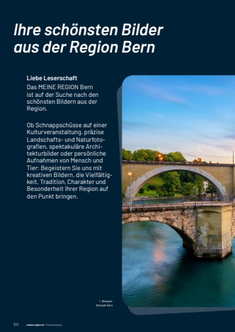 102 meine-region.ch meine-region.ch FotowettbewerbIhre sch%u00f6nsten Bilder aus der Region BernLiebe LeserschaftDas%u0009MEINE%u0009REGION%u0009Bern%u0009ist auf der Suche nach den sch%u00f6nsten%u0009Bildern%u0009aus%u0009der%u0009Region. Ob Schnappsch%u00fcsse auf einer Kulturveranstaltung,%u0009pr%u00e4zise%u0009Landschafts-%u0009und%u0009Naturfotografi%u0009en,%u0009spektakul%u00e4re%u0009Architekturbilder%u0009oder%u0009pers%u00f6nliche%u0009Aufnahmen von Mensch und Tier: Begeistern Sie uns mit kreativen Bildern, die Vielf%u00e4ltigkeit, Tradition, Charakter und Besonderheit Ihrer Region auf den Punkt bringen.1. Beispiel:Altstadt Bern