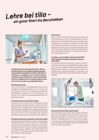 108 meine-region.ch Top LehrbetriebLehre bei tilia %u2013 ein guter Start ins Berufslebentilia %u00f6ffnet die T%u00fcren f%u00fcr junge Menschen, die ihre berufl iche Reise in der Pfl ege und Betreuung oder weiteren Branchen beginnen m%u00f6chten. Bei tilia stehen bezugs- und palliative-care-orientierte Pfl ege und Betreuung im Mittelpunkt, wodurch den Bewohnerinnen und Bewohnern ein Zuhause geboten wird, in dem sie sich rundum gut aufgehoben f%u00fchlen.Dein Weg zum Erfolgtilia ist stolz darauf, ein Ausbildungsbetrieb mit einer langj %u00e4hrigen Erfolgsgeschichte zu sein. Jahr f%u00fcr Jahr schliessen mehr als 20 Lernende aus verschiedenen Berufsfeldern erfolgreich ihre Ausbildung bei uns ab. Bei tilia fi ndest Du Ausbildungsm%u00f6glichkeiten in folgenden Berufen:Fachfrau/Fachmann Gesundheit (FaGe)Als FaGe bei tilia erlebst Du ein einf%u00fchlsames und abwechslungsreiches Arbeitsumfeld, in dem Du mitten im Geschehen bist. Du pfl egst, betreust und begleitest die Bewohnerinnen und Bewohner im Alltag. Zus%u00e4tzlich zu den vielseitigen pfl egerischen und betreuenden Aufgaben %u00fcbernimmst Du auch herausfordernde medizinaltechnische, administrative und logistische Funktionen.Assistentin/Assistent Gesundheit und Soziales (AGS)Als AGS bei tilia arbeitest Du im Team mit diplomierten Pfl egefachpersonen und Fachpersonen Gesundheit (FaGe). Deine Hauptaufgaben umfassen das Mitwirken und Unterst%u00fctzen bei Pfl ege- und Betreuungsaufgaben der Bewohnenden, begleiten der Bewohnenden bei Aktivit%u00e4ten im Alltag und Haushalt sowie bei der Ausf%u00fchrung logistischer Arbeiten.K%u00f6chin/KochWenn Du Dich f%u00fcr das Kochen begeisterst, bietet tilia Dir die M%u00f6glichkeit, in der Produktionsk%u00fcche in Wittigkofen (ab 2025 in Ittigen) die Kunst der Herstellung und Pr%u00e4sentation von warmen und kalten Gerichten sowie verschiedenen S%u00fcssspeisen zu erlernen. Du wirst den gesamten Prozess rund um die K%u00fcche kennenlernen, die betrieblichen Abl%u00e4ufe verstehen und mitgestalten sowie betriebswirtschaftlich- und %u00f6kologisches Denken und Handeln erlernen.Fachfrau/- mann Hotellerie-Hauswirtschaft EFZ oder Praktikerin/Praktiker Hotellerie-Hauswirtschaft EBADu sorgst als Fachfrau/Fachmann Hotellerie-Hauswirtschaft f%u00fcr Sauberkeit und Wohlbefi nden. Deine Aufgaben umfassen die Bereiche Beraten und Bedienen der Bewohnenden, Reinigen und Gestalten von R%u00e4umen, Ausf%u00fchren der W%u00e4scheversorgung, Zubereiten und Verteilen von Gerichten und Ausf%u00fchren administrativer Arbeiten.Fachfrau/Fachmann BetriebsunterhaltAls Fachfrau/Fachmann Betriebsunterhalt sorgst Du daf%u00fcr, dass alle Ger%u00e4te und Einrichtungen in und um das Geb%u00e4ude einwandfrei funktionieren und f%u00fchrst fachgerecht Gr%u00fcnpfl egearbeiten im Aussen- und Innenbereich durch. Du leistest damit einen wichtigen Beitrag zur Lebensqualit%u00e4t der Bewohnerinnen und Bewohner sowie zur Natur und Umwelt.