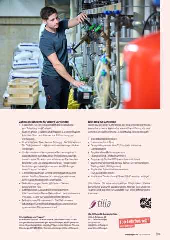 meine-region.ch meine-region.chTop Lehrbetriebe Top Lehrbetrieb 1092tilia Stiftung f%u00fcr Langzeitpfl egeUntere%u0009Zollgasse%u0009283072 Ostermundigen031 930 01 00info@tilia-stiftung.chwww.tilia-stiftung.chInformationen und Fragen?Interessierst Du Dich f%u00fcr eine unserer Lehrstellen? Hast Du alle n%u00f6tigen%u0009Informationen%u0009oder%u0009gibt%u0009es%u0009noch%u0009Fragen,%u0009die%u0009Du%u0009gerne%u0009vor%u0009deiner%u0009Bewerbung%u0009kl%u00e4ren%u0009m%u00f6chtest?%u0009Dann%u0009melde%u0009Dich%u0009bei%u0009Therese%u0009Ellenberger 031 930 33 54 / therese.ellenberger@tilia-stiftung.chZahlreiche Benefi ts f%u00fcr unsere Lernenden%u2022 6 Wochen Ferien: tilia sch%u00e4tzt die Bedeutung von Erholung und Freizeit.%u2022 T%u00e4glich gratis Fr%u00fcchte und Wasser: Es steht t%u00e4glich frisches Obst und Wasser zur Erfrischung zur Verf%u00fcgung.%u2022 Gratis Kaffee / Tee / heisse Schoggi: Bei tilia kannst Du Dich jederzeit mit kostenlosen Heissgetr%u00e4nken versorgen.%u2022 Umfassende und kompetente Betreuung durch ausgebildete Berufsbildner:innen und Bildungsbeauftragte: Du wirst von erfahrenen Fachleuten begleitet und unterst%u00fctzt sowie bei Fragen oder Ausbildungschwierigkeiten von den Bildungsbeauftragten beraten.%u2022 Lernendenausfl ug: Einmal j%u00e4hrlich wirst Du mit einem Ausfl ug %u00fcberrascht %u2013 denn gemeinsame Aktivit%u00e4ten f%u00f6rdern den Teamgeist.%u2022 Geburtstagsgeschenk: Wir feiern Deinen besonderen Tag.%u2022 Betriebliches Gesundheitsmanagement:tilia investiert in Deine Gesundheit, beispielsweise mit 200.%u2013/Jahr f%u00fcr Gesundheitsf%u00f6rderung.%u2022 Teilnahme an Firmenevents: Sei Teil unseres lebendigen Gemeinschaftsgef%u00fchls und nimm an spannenden Firmenevents teil.Dein Weg zur Lehrstelle Wenn Du an einer Lehrstelle bei tilia interessiert bist, besuche unsere Webseite www.tilia-stiftung.ch und schicke uns Deine Online-Bewerbung. Wir ben%u00f6tigen:%u2022 Bewerbungsschreiben%u2022 Lebenslauf mit Foto%u2022 Zeugniskopien ab dem 7. Schuljahr inklusive Lernberichte%u2022 Angabe einer Referenzperson (Adresse und Telefonnummer)%u2022 Angabe, ob Du die BMS besuchen m%u00f6chtest%u2022 Wunscharbeitsort (Elfenau, K%u00f6niz, Ostermundigen, Steingr%u00fcebli, Wittigkofen)%u2022 Kopie des Aufenthaltsausweises (f%u00fcr Ausl%u00e4nder:innen)%u2022 Kopie des Deutschzertifi kats (f%u00fcr Fremdsprachige)tilia bietet Dir eine einzigartige M%u00f6glichkeit, Deine berufl iche Zukunft zu gestalten. Werde Teil unseres Teams und leg den Grundstein f%u00fcr eine erfolgreiche Karriere!