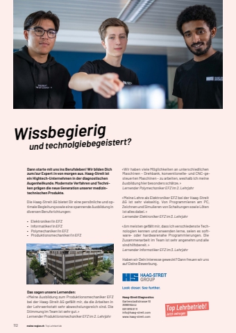 112 meine-region.ch Top Lehrbetrieb meine-region.ch Top Lehrbetriebe 1Haag-Streit DiagnosticsGartenstadtstrasse 103098%u0009K%u00f6niz031 978 01 11info@haag-streit.comwww.haag-streit.comWissbegierig und technolgiebegeistert?Dann starte mit uns ins Berufs leben! Wir bilden Dich zum/zur Expert:in von morgen aus. Haag-Streit ist ein Hightech-Unternehmen in der diagnostischen Augenheilkunde. Modernste Verfahren und Techniken pr%u00e4gen die neue Generation unserer medizintechnischen Produkte.Die Haag-Streit AG bietet Dir eine pers%u00f6nliche und optimale Begleitung sowie eine spannende Ausbildung in diversen Berufsrichtungen:%u2022 Elektroniker/in EFZ %u2022 Informatiker/in EFZ %u2022 Polymechaniker/in EFZ %u2022 Produktionsmechaniker/in EFZ %u00abWir haben viele M%u00f6glichkeiten an unterschiedlichen Maschinen %u2013 Drehbank, konventionelle- und CNC-gesteuerten Maschinen %u2013 zu arbeiten, weshalb ich meine Ausbildung hier besonders sch%u00e4tze.%u00bbLernender Polymechaniker EFZ im 2. Lehrjahr%u00abMeine Lehre als Elektroniker EFZ bei der Haag-Streit AG ist sehr vielseitig. Von Programmieren am PC, Zeichnen und Simulieren von Schaltungen sowie L%u00f6ten ist alles dabei.%u00bb Lernender Elektroniker EFZ im 3. Lehrjahr%u00abAm meisten gef%u00e4llt mir, dass ich verschiedenste Technologien kennen und anwenden lerne, seien es software- oder hardwarenahe Programmierungen. Die Zusammenarbeit im Team ist sehr angenehm und alle sind hilfsbereit.%u00bb Lernender Informatiker EFZ im 3. LehrjahrHaben wir Dein Interesse geweckt? Dann freuen wir uns auf Deine Bewerbung. Das sagen unsere Lernenden:%u00abMeine Ausbildung zum Produktionsmechaniker EFZ bei der Haag-Streit AG gef%u00e4llt mir, da die Arbeiten in der Lehrwerkstatt sehr abwechslungsreich sind. Die Stimmung im Team ist sehr gut.%u00bb Lernender Produktionsmechaniker EFZ im 2. Lehrjahr