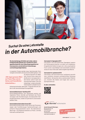 meine-region.ch Top Lehrbetriebe 1 meine-region.ch Top Lehrbetrieb 113Haag-Streit DiagnosticsGartenstadtstrasse 103098%u0009K%u00f6niz031 978 01 11info@haag-streit.comwww.haag-streit.comWissbegierig und technolgiebegeistert?Dann starte mit uns ins Berufs leben! Wir bilden Dich zum/zur Expert:in von morgen aus. Haag-Streit ist ein Hightech-Unternehmen in der diagnostischen Augenheilkunde. Modernste Verfahren und Techni,ken pr%u00e4gen die neue Generation unserer medizin,technischen Produkte.Die Haag-Streit AG bietet Dir eine pers%u00f6nliche und op,timale Begleitung sowie eine spannende Ausbildung in diversen Berufsrichtungen:%u2022 Elektroniker/in EFZ %u2022 Informatiker/in EFZ %u2022 Polymechaniker/in EFZ %u2022 Produktionsmechaniker/in EFZ %u00abWir haben viele M%u00f6glichkeiten an unterschiedlichen Maschinen %u2013 Drehbank, konventionelle- und CNC-ge,steuerten Maschinen %u2013 zu arbeiten, weshalb ich meine Ausbildung hier besonders sch%u00e4tze.%u00bbLernender Polymechaniker EFZ im 2. Lehrjahr%u00abMeine Lehre als Elektroniker EFZ bei der Haag-Streit AG ist sehr vielseitig. Von Programmieren am PC, Zeichnen und Simulieren von Schaltungen sowie L%u00f6ten ist alles dabei.%u00bb Lernender Elektroniker EFZ im 3. Lehrjahr%u00abAm meisten gef%u00e4llt mir, dass ich verschiedenste Tech,nologien kennen und anwenden lerne, seien es soft,ware- oder hardwarenahe Programmierungen. Die Zusammenarbeit im Team ist sehr angenehm und alle sind hilfsbereit.%u00bb Lernender Informatiker EFZ im 3. LehrjahrHaben wir Dein Interesse geweckt? Dann freuen wir uns auf Deine Bewerbung. Das sagen unsere Lernenden:%u00abMeine Ausbildung zum Produktionsmechaniker EFZ bei der Haag-Streit AG gef%u00e4llt mir, da die Arbeiten in der Lehrwerkstatt sehr abwechslungsreich sind. Die Stimmung im Team ist sehr gut.%u00bb Lernender Produktionsmechaniker EFZ im 2. Lehrjahrmeine-region.ch Top Lehrbetriebe 1Aaretal Garage AG M%u00fcnsingenBernstrasse 91 %u2013 933110 M%u00fcnsingen 031 721 33 33info@aaretal-garage.comwww.aaretal-garage.ch Suchst Du eine Lehrstelle in der Automobilbranche?Die Aaretal Garage AG bildet seit vielen Jahren erfolgreich Berufsleute aus. Ein Beruf im Autogewerbe bietet Dir eine Zukunftsperspektive mit interessanten und attraktiven Entwicklungsund Aufstiegsm%u00f6glichkeiten.In rasantem Tempo werden neue, faszinierende Technologien entwickelt und neue Automodelle gebaut. Und Du kannst hautnah mit dabei sein. Kommt hinzu, dass sich die Berufe im Autogewerbe in den letzten Jahren stark weiterentwickelt haben: Sie sind vielseitiger, anspruchsvoller, interessanter und damit auch vielversprechender geworden. Folgende Berufe werden in der Aaretal Garage AG ausgebildet:Automobilfachmann/-fachfrau EFZAutomobilfachm%u00e4nner und -fachfrauen warten und reparieren Motor, Antrieb und Fahrwerk von Personenwagen oder Nutzfahrzeugen. Sie %u00fcberpr%u00fcfen Fahrzeugkomponenten, stellen sie optimal ein und ersetzen defekte Teile.Automobilmechatroniker/innen EFZAutomobilmechatroniker/innen f%u00fchren bei Personenwagen oder Nutzfahrzeugen System pr%u00fcfungen und einfache Diagnosearbeiten durch. Sie %u00fcbernehmen Wartungs- und Reparaturarbeiten an Motor, Antrieb, Fahrwerk und Elektronik.Carrossier/in Spenglerei EFZCarrossiers und Carrossierinnen Spenglerei reparieren Fahrzeugcarrosserien, vor allem von Unfallautos. Eingedr%u00fcckte Stellen bringen sie in die urspr%u00fcngliche Form zur%u00fcck, besch%u00e4digte Carrosserieteile ersetzen sie durch neue Teile oder selbst angefertigte Bleche.Carrossier/in Lackiererei EFZCarrossiers und Carrossierinnen Lackiererei versch%u00f6nern, sch%u00fctzen, erneuern und beschriften Fahrzeugoberfl %u00e4chen. Sie bereiten die zu lackierenden Fl%u00e4chen vor, mischen die Farben und tragen den Lack mit Spritzpistolen auf.Zu den Lehrstellen:%u00abWir legen grossen Wert auf Team Play und ein faires und freundliches Arbeitsklima.%u00bb