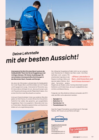 meine-region.ch meine-region.chTop Lehrbetriebe Top Lehrbetrieb 1171Guggisberg Dachtechnik AGSeftigenstrasse 3123084%u0009Wabern031 960 16 16info@guggisberg-bern.chwww.guggisberg-bern.ch Deine Lehrstellemit der besten Aussicht!Interessierst Du Dich f%u00fcr einen Beruf rund um die Geb%u00e4udeh%u00fclle? Dann bist Du bei Guggisberg an der richtigen Adresse: Wir bieten Ausbildungen f%u00fcr verschiedene interessante Berufsrichtungen in den Bereichen Dach, Fassade und Energie.Als einer der f%u00fchrenden Lehrbetriebe f%u00fcr Geb%u00e4udeh%u00fcllen in der Region Bern und K%u00f6niz bilden wir mit Freude und Engagement junge, interessierte Menschen aus. Ein besonderes Anliegen ist uns, dass auch junge Leute mit Migrationshintergrund die M%u00f6glichkeit haben, ihre ersten Schritte in der Berufswelt zu machen.Und auch Quereinsteiger:innen aus anderen Berufen geben wir die Chance, in unserer Branche mitzuwirken. Nat%u00fcrlich hat selbst das gesamte, gut ausgebildete Guggisberg-Team nie ausgelernt. Besonders bei neuen Materialien, Bearbeitungstechniken und Systemen bilden wir uns regelm%u00e4ssig weiter.Der Alltag bei Guggisberg fi ndet nicht nur an unseren zwei Standorten in Wabern bei Bern statt. Viel %u00f6fter befi nden sich unsere Mitarbeitenden irgendwo in der Region in luftiger H%u00f6he und das bei jedem Wetter. Dort oben herrschen andere Regeln als am Boden unten. So birgt die Arbeit sowohl Gefahren und Hindernisse, als auch unglaubliche Aussichten und Abwechslung.Folgende vier Berufslehren k%u00f6nnen entweder als EFZoder als EBA-Lehre absolviert werden:%u2022 Spengler/-in%u2022 Abdichter/-in%u2022 Dachdecker/-in%u2022 Fassadenbauer/-inHast Du Fragen? Kontaktier uns einfach per E-Mail oder Telefon. Wir freuen uns auf Deine Anfrage!%u00abOffene Lehrstellen in Bern. Jetzt bewerben und hoch hinaus kommen!%u00bb