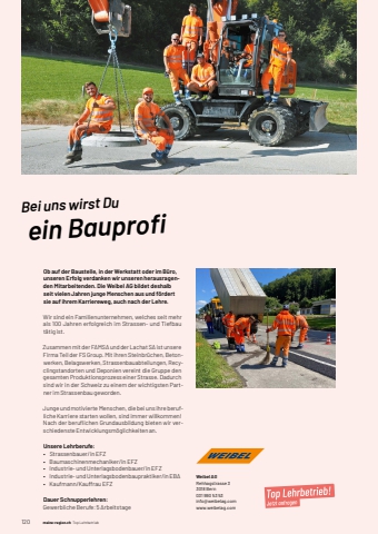 120 meine-region.ch Top Lehrbetrieb meine-region.ch Top Lehrbetriebe 1Weibel AGRehhagstrasse 33018 Bern031 990 53 53info@weibelag.comwww.weibelag.comBei uns wirst Du ein Bauprofi Ob auf der Baustelle, in der Werkstatt oder im B%u00fcro, unseren Erfolg verdanken wir unseren herausragenden Mitarbeitenden. Die Weibel AG bildet deshalb seit vielen Jahren junge Menschen aus und f%u00f6rdert sie auf ihrem Karriereweg, auch nach der Lehre.Wir sind ein Familienunternehmen, welches seit mehr als 100 Jahren erfolgreich im Strassen- und Tiefbau t%u00e4tig ist.Zusammen mit der FAMSA und der Lachat SA ist unsere Firma Teil der FS Group. Mit ihren Steinbr%u00fcchen, Betonwerken, Belagswerken, Strassenbauabteilungen, Recyclingstandorten und Deponien vereint die Gruppe den gesamten Produktionsprozess einer Strasse. Dadurch sind wir in der Schweiz zu einem der wichtigsten Partner im Strassenbau geworden. Junge und motivierte Menschen, die bei uns ihre berufliche Karriere starten wollen, sind immer willkommen! Nach der berufl ichen Grundausbildung bieten wir verschiedenste Entwicklungsm%u00f6glichkeiten an.Unsere Lehrberufe:%u2022 Strassenbauer/in EFZ %u2022 Baumaschinenmechaniker/in EFZ%u2022 Industrie- und Unterlagsbodenbauer/in EFZ%u2022 Industrie- und Unterlagsbodenbaupraktiker/in EBA%u2022 Kaufmann/Kauffrau EFZ Dauer Schnupperlehren:Gewerbliche Berufe: 5 Arbeitstage