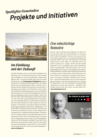 meine-region.ch meine-region.ch Gemeinden 151Spotlights Gemeinden Projekte und InitiativenIm Einklang mit der ZukunftDie Welt befi ndet sich im Zustand der st%u00e4ndigen Ver%u00e4nderung. Auf uns Menschen kommen immer wieder neue Aufgaben zu und wir sind gefordert, anpassungsf%u00e4hig zu sein %u2013 an unsere Umwelt, aber auch an unsere Mitmenschen. Der Schlossgarten Riggisberg begleitet Menschen mit Beeintr%u00e4chtigungen darin, ein selbstbestimmtes und w%u00fcrdevolles Leben zu f%u00fchren. Durch Beachtung ihrer Bed%u00fcrfnisse werden sinnstiftende Lebensr%u00e4ume geschaffen, die Mitarbeiter:innen treffen auf erf%u00fcllbare Arbeitsbedingungen und ein erf%u00fcllendes Arbeitsumfeld. Ein Grossteil der Geb%u00e4ude des Schlossgartens Riggisberg stammt aus den 1960er-Jahren. Die %u00fcber 50 Jahre alten Wohnh%u00e4user entsprechen teilweise nicht mehr den heutigen Bed%u00fcrfnissen der Bewohner:innen. Deshalb sollen neue Wohnr%u00e4ume entstehen. Seit Mai 2022 befi ndet sich das Projekt f%u00fcr die erste Etappe in Entwicklung. Das beste Projekt des %u00f6ffentlich ausgeschriebenen Architektur-Wettbewerbs, %u00abIM EINKLANG%u00bb des Planerteams unter der Leitung von rollimarchini architekten aus Bern, wurde anfangs 2023 ausgezeichnet. Verkleinerte Wohngruppen, Einzelzimmer mit eigenem Bad und Studiowohnungen f%u00fcr Einzelpersonen oder Paare sind zeitgem%u00e4sse L%u00f6sungen f%u00fcr ein selbstbestimmtes Leben. Der Schlossgarten r%u00fcstet sich f%u00fcr die Zukunft und geht mit der Zeit. Er beabsichtigt, das siegreiche Planer-Team mit der Projektierung zu beauftragen. Ende 2024 ist man vielleicht schon einige Schritte in Richtung Zukunft gegangen...www.schlogari.chEine vielschichtigeRealsatireSeit 22 Jahren geniesst das Publikum auf dem Gurten alle zwei Jahre ein Freilichttheater. Im Sommer 2024 fi ndet die doppelte Premiere vom neuen St%u00fcck %u00abDa ch%u00f6nnt ja jede cho!%u00bb von Livia Anne Richard und Christoph Keller statt. Der Titel tr%u00e4gt das Thema des St%u00fccks schon in sich: Wenn wir Schweizer:innen %u00abda ch%u00f6nnt ja jede cho!%u00bb sagen, meinen wir das exakte Gegenteil. Und so behandelt denn diese Realsatire einen brandaktuellen Themenkomplex rund um die Abh%u00e4ngigkeit der Schweiz, was ausl%u00e4ndische Arbeitskr%u00e4fte anbelangt und dem gleichzeitigen auf der Bremse stehen, wenn es darum geht, diese Menschen hier auch wirklich zu integrieren. Gespielt werden die Figuren von einem Ensemble, bestehend aus 15 Amateur- und Profi schauspieler:innen aus f%u00fcnf verschiedenen Nationen. Der Vorverkauf beginnt am Montag, 25. M%u00e4rz 2024 um 10 Uhr. Bis dahin sind Gutscheine %u2013 wahlweise mit oder ohne Kulinarik %u2013 erh%u00e4ltlich. Das Theater Gurten freut sich, denn %u00abes d%u00f6rf jede cho!%u00bb www.theatergurten.chDa ch%u00f6nnt ja jede cho!TG-2024_Inserat_Meine-Region_89x57.5_RZ.indd 1 14.12.23 16:22