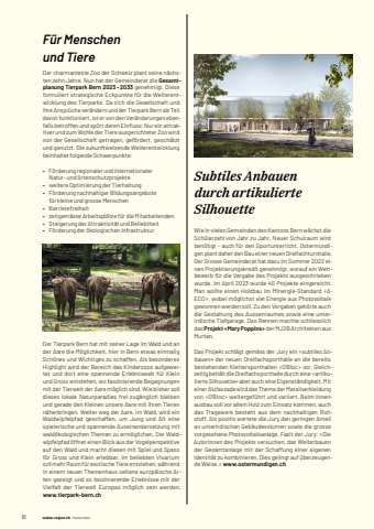 162 meine-region.ch meine-region.ch GemeindenF%u00fcr Menschen und TiereDer charmanteste Zoo der Schweiz plant seine n%u00e4chsten zehn Jahre. Nun hat der Gemeinderat die Gesamtplanung Tierpark Bern 2023 %u2013 2033 genehmigt. Diese formuliert strategische Eckpunkte f%u00fcr die Weiterentwicklung des Tierparks. Da sich die Gesellschaft und ihre Anspr%u00fcche ver%u00e4ndern und der Tierpark Bern als Teil davon funktioniert, ist er von den Ver%u00e4nderungen ebenfalls betroffen und sp%u00fcrt deren Einfl uss: Nur ein attraktiver und zum Wohle der Tiere ausgerichteter Zoo wird von der Gesellschaft getragen, gef%u00f6rdert, gesch%u00e4tzt und genutzt. Die zukunftweisende Weiterentwicklung beinhaltet folgende Schwerpunkte:%u2022 F%u00f6rderung regionaler und internationaler Natur- und Artenschutzprojekte%u2022 weitere Optimierung der Tierhaltung%u2022 F%u00f6rderung nachhaltiger Bildungsangebote f%u00fcr kleine und grosse Menschen%u2022 Barrierefreiheit%u2022 zeitgem%u00e4sse Arbeitspl%u00e4tze f%u00fcr die Mitarbeitenden%u2022 Steigerung der Attraktivit%u00e4t und Beliebtheit%u2022 F%u00f6rderung der %u00f6kologischen InfrastrukturDer Tierpark Bern hat mit seiner Lage im Wald und an der Aare die M%u00f6glichkeit, hier in Bern etwas einmalig Sch%u00f6nes und Wichtiges zu schaffen. Als besonderes Highlight wird der Bereich des Kinderzoos aufgewertet und dort eine spannende Erlebniswelt f%u00fcr Klein und Gross entstehen, wo faszinierende Begegnungen mit der Tierwelt der Aare m%u00f6glich sind. Wie bisher soll dieses lokale Naturparadies frei zug%u00e4nglich bleiben und gerade den Kleinen unsere Aare mit ihren Tieren n%u00e4herbringen. Weiter weg der Aare, im Wald, wird ein Waldwipfelpfad geschaffen, um Jung und Alt eine spielerische und spannende Auseinandersetzung mit wald%u00f6kologischen Themen zu erm%u00f6glichen. Der Waldwipfelpfad %u00f6ffnet einen Blick aus der Vogelperspektive auf den Wald und macht diesen mit Spiel und Spass f%u00fcr Gross und Klein erlebbar. Im beliebten Vivarium soll mehr Raum f%u00fcr exotische Tiere entstehen, w%u00e4hrend in einem neuen Themenhaus seltene europ%u00e4ische Arten gezeigt und so faszinierende Erlebnisse mit der Vielfalt der Tierwelt Europas m%u00f6glich sein werden. www.tierpark-bern.chSubtiles Anbauendurch artikulierte SilhouetteWie in vielen Gemeinden des Kantons Bern w%u00e4chst die Sch%u00fclerzahl von Jahr zu Jahr. Neuer Schulraum wird ben%u00f6tigt %u2013 auch f%u00fcr den Sportunterricht. Ostermundigen plant daher den Bau einer neuen Dreifachturnhalle. Der Grosse Gemeinderat hat dazu im Sommer 2022 einen Projektierungskredit genehmigt, worauf ein Wettbewerb f%u00fcr die Vergabe des Projekts ausgeschrieben wurde. Im April 2023 wurde 40 Projekte eingereicht. Man wollte einen Holzbau im Minergie-Standard %u00abAECO%u00bb, wobei m%u00f6glichst viel Energie aus Photovoltaik gewonnen werden soll. Zu den Vorgaben geh%u00f6rte auch die Gestaltung des Aussenraumes sowie eine unterirdische Tiefgarage. Das Rennen machte schliesslich das Projekt %u00abMary Poppins%u00bb der MJ2B Architekten aus Murten.Das Projekt schl%u00e4gt gem%u00e4ss der Jury ein %u00absubtiles Anbauen%u00bb der neuen Dreifachsporthalle an die bereits bestehenden Klettersporthallen %u00abO%u2019Bloc%u00bb vor. Gleichzeitig beh%u00e4lt die Dreifachsporthalle durch eine %u00abartikulierte Silhouette%u00bb aber auch eine Eigenst%u00e4ndigkeit. Mit einer Alufassade wird das Thema der Metallverkleidung von %u00abO%u2019Bloc%u00bb weitergef%u00fchrt und variiert. Beim Innenausbau soll vor allem Holz zum Einsatz kommen, auch das Tragewerk besteht aus dem nachhaltigen Rohstoff. Als positiv wertete die Jury den geringen Anteil an unterirdischen Geb%u00e4udevolumen sowie die grosse vorgesehene Photovoltaikanlage. Fazit der Jury: %u00abDie Autorinnen des Projekts versuchen, das Weiterbauen der Gesamtanlage mit der Schaffung einer eigenen Identit%u00e4t zu kombinieren. Dies gelingt auf %u00fcberzeugende Weise.%u00bb www.ostermundigen.ch