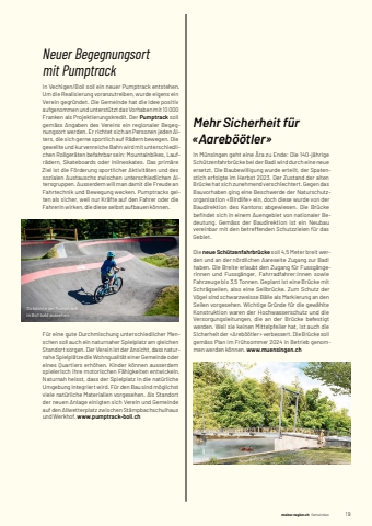 meine-region.ch meine-region.ch Gemeinden 193Neuer Begegnungsort mit PumptrackIn Vechigen/Boll soll ein neuer Pumptrack entstehen. Um die Realisierung voranzutreiben, wurde eigens ein Verein gegr%u00fcndet. Die Gemeinde hat die Idee positiv aufgenommen und unterst%u00fctzt das Vorhaben mit 10 000 Franken als Projektierungskredit. Der Pumptrack soll gem%u00e4ss Angaben des Vereins ein regionaler Begegnungsort werden. Er richtet sich an Personen jeden Alters, die sich gerne sportlich auf R%u00e4dern bewegen. Die gewellte und kurvenreiche Bahn wird mit unterschiedlichen Rollger%u00e4ten befahrbar sein: Mountainbikes, Laufr%u00e4dern, Skateboards oder Inlineskates. Das prim%u00e4re Ziel ist die F%u00f6rderung sportlicher Aktivit%u00e4ten und des sozialen Austauschs zwischen unterschiedlichen Altersgruppen. Ausserdem will man damit die Freude an Fahrtechnik und Bewegung wecken. Pumptracks gelten als sicher, weil nur Kr%u00e4fte auf den Fahrer oder die Fahrerin wirken, die diese selbst aufbauen k%u00f6nnen.Mehr Sicherheit f%u00fcr %u00abAareb%u00f6%u00f6tler%u00bbIn M%u00fcnsingen geht eine %u00c4ra zu Ende: Die 140-j%u00e4hrige Sch%u00fctzenfahrbr%u00fccke bei der Badi wird durch eine neue ersetzt. Die Baubewilligung wurde erteilt, der Spatenstich erfolgte im Herbst 2023. Der Zustand der alten Br%u00fccke hat sich zunehmend verschlechtert. Gegen das Bauvorhaben ging eine Beschwerde der Naturschutzorganisation %u00abBirdlife%u00bb ein, doch diese wurde von der Baudirektion des Kantons abgewiesen. Die Br%u00fccke befi ndet sich in einem Auengebiet von nationaler Bedeutung. Gem%u00e4ss der Baudirektion ist ein Neubau vereinbar mit den betreffenden Schutzzielen f%u00fcr das Gebiet. Die neue Sch%u00fctzenfahrbr%u00fccke soll 4,5 Meter breit werden und an der n%u00f6rdlichen Aareseite Zugang zur Badi haben. Die Breite erlaubt den Zugang f%u00fcr Fussg%u00e4ngerinnen und Fussg%u00e4nger, Fahrradfahrer:innen sowie Fahrzeuge bis 3,5 Tonnen. Geplant ist eine Br%u00fccke mit Schr%u00e4gseilen, also eine Seilbr%u00fccke. Zum Schutz der V%u00f6gel sind schwarzweisse B%u00e4lle als Markierung an den Seilen vorgesehen. Wichtige Gr%u00fcnde f%u00fcr die gew%u00e4hlte Konstruktion waren der Hochwasserschutz und die Versorgungsleitungen, die an der Br%u00fccke befestigt werden. Weil sie keinen Mittelpfeiler hat, ist auch die Sicherheit der %u00abAreb%u00f6%u00f6tler%u00bb verbessert. Die Br%u00fccke soll gem%u00e4ss Plan im Fr%u00fchsommer 2024 in Betrieb genommen werden k%u00f6nnen. www.muensingen.chSo%u0009k%u00f6nnte%u0009der%u0009Pumptrack%u0009in Boll bald aussehen.F%u00fcr eine gute Durchmischung unterschiedlicher Menschen soll auch ein naturnaher Spielplatz am gleichen Standort sorgen. Der Verein ist der Ansicht, dass naturnahe Spielpl%u00e4tze die Wohnqualit%u00e4t einer Gemeinde oder eines Quartiers erh%u00f6hen. Kinder k%u00f6nnen ausserdem spielerisch ihre motorischen F%u00e4higkeiten entwickeln. Naturnah heisst, dass der Spielplatz in die nat%u00fcrliche Umgebung integriert wird. F%u00fcr den Bau sind m%u00f6glichst viele nat%u00fcrliche Materialien vorgesehen. Als Standort der neuen Anlage einigten sich Verein und Gemeinde auf den Allwetterplatz zwischen St%u00e4mpbachschulhaus und Werkhof. www.pumptrack-boll.ch