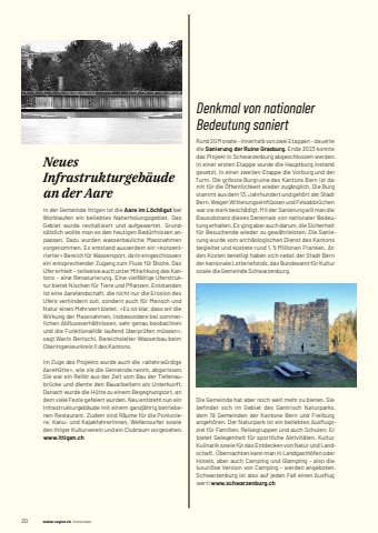 204 meine-region.ch meine-region.ch GemeindenNeues Infrastrukturgeb%u00e4ude an der AareIn der Gemeinde Ittigen ist die Aare im L%u00f6chligut bei Worblaufen ein beliebtes Naherholungsgebiet. Das Gebiet wurde revitalisiert und aufgewertet. Grunds%u00e4tzlich wollte man es den heutigen Bed%u00fcrfnissen anpassen. Dazu wurden wasserbauliche Massnahmen vorgenommen. Es entstand ausserdem ein %u00abkonzentrierter%u00bb Bereich f%u00fcr Wassersport, darin eingeschlossen ein entsprechender Zugang zum Fluss f%u00fcr Boote. Das Ufer erhielt %u2013 teilweise auch unter Mitwirkung des Kantons %u2013 eine Renaturierung. Eine vielf%u00e4ltige Uferstruktur bietet Nischen f%u00fcr Tiere und Pfl anzen. Entstanden ist eine Aarelandschaft, die nicht nur die Erosion des Ufers verhindern soll, sondern auch f%u00fcr Mensch und Natur einen Mehrwert bietet. %u00abEs ist klar, dass wir die Wirkung der Massnahmen, insbesondere bei sommerlichen Abfl ussverh%u00e4ltnissen, sehr genau beobachten und die Funktionalit%u00e4t laufend %u00fcberpr%u00fcfen m%u00fcssen%u00bb, sagt Warin Bertschi, Bereichsleiter Wasserbau beim Oberingenieurkreis II des Kantons.Im Zuge des Projekts wurde auch die %u00abaltehrw%u00fcrdige Aareh%u00fctte%u00bb, wie sie die Gemeinde nennt, abgerissen. Sie war ein Relikt aus der Zeit vom Bau der Tiefenaubr%u00fccke und diente den Bauarbeitern als Unterkunft. Danach wurde die H%u00fctte zu einem Begegnungsort, an dem viele Feste gefeiert wurden. Neu entsteht nun ein Infrastrukturgeb%u00e4ude mit einem ganzj%u00e4hrig betriebenen Restaurant. Zudem sind R%u00e4ume f%u00fcr die Pontoniere, Kanu- und Kajakfahrerinnen, Wellensurfer sowie den Ittiger Kulturverein und ein Clubraum vorgesehen. www.ittigen.chDenkmal von nationaler Bedeutung saniertRund 20 Monate %u2013 innerhalb von zwei Etappen %u2013 dauerte die Sanierung der Ruine Grasburg. Ende 2023 konnte das Projekt in Schwarzenburg abgeschlossen werden. In einer ersten Etappe wurde die Hauptburg instand gesetzt, in einer zweiten Etappe die Vorburg und der Turm. Die gr%u00f6sste Burgruine des Kantons Bern ist damit f%u00fcr die %u00d6ffentlichkeit wieder zug%u00e4nglich. Die Burg stammt aus dem 13. Jahrhundert und geh%u00f6rt der Stadt Bern. Wegen Witterungseinfl %u00fcssen und Felsabbr%u00fcchen war sie stark besch%u00e4digt. Mit der Sanierung will man die Bausubstanz dieses Denkmals von nationaler Bedeutung erhalten. Es ging aber auch darum, die Sicherheit f%u00fcr Besuchende wieder zu gew%u00e4hrleisten. Die Sanierung wurde vom arch%u00e4ologischen Dienst des Kantons begleitet und kostete rund 1, 5 Millionen Franken. An den Kosten beteiligt haben sich nebst der Stadt Bern der kantonale Lotteriefonds, das Bundesamt f%u00fcr Kultur sowie die Gemeinde Schwarzenburg.Die Gemeinde hat aber noch weit mehr zu bieten. Sie befi ndet sich im Gebiet des Gantrisch Naturparks, dem 19 Gemeinden der Kantone Bern und Freiburg angeh%u00f6ren. Der Naturpark ist ein beliebtes Ausfl ugsziel f%u00fcr Familien, Reisegruppen und auch Schulen. Er bietet Gelegenheit f%u00fcr sportliche Aktivit%u00e4ten, Kultur, Kulinarik sowie f%u00fcr das Entdecken von Natur und Landschaft. %u00dcbernachten kann man in Landgasth%u00f6fen oder Hotels, aber auch Camping und Glamping %u2013 also die luxuri%u00f6se Version von Camping %u2013 werden angeboten. Schwarzenburg ist also auf jeden Fall einen Ausfl ug wert! www.schwarzenburg.ch