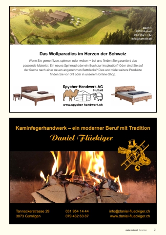 meine-region.ch Gemeinden 21Kaminfegerhandwerk %u2013 ein moderner Beruf mit TraditionTannackerstrasse 293073 G%u00fcmligeninfo@daniel-fl ueckiger.chwww.daniel-fl ueckiger.ch031 954 14 44 079 432 63 87Das Wollparadies im Herzen der SchweizWenn Sie gerne filzen, spinnen oder weben %u2013 bei uns finden Sie garantiert das passende Material. Ein neues Spinnrad oder ein Buch zur Inspiration? Oder sind Sie auf der Suche nach einer neuen angenehmen Bettdecke? Dies und viele weitere Produkte finden Sie vor Ort oder in unserem Online-Shop.B%u00e4ch 44953 Huttwil 062 962 11 52 info@kamele.ch www.spycher-handwerk.ch