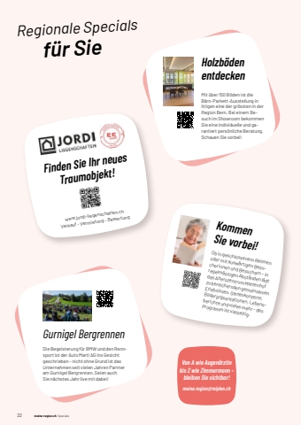 22 meine-region.ch SpecialsRegionale Specials f%u00fcr Sie1 meine-region.ch Von A wie Augen%u00e4rztin bis Z wie Zimmermann %u2013 bleiben Sie sichtbar! meine.region@miplan.chFinden Sie Ihr neues Traumobjekt!Holzb%u00f6denentdeckenMit %u00fcber 150 B%u00f6den ist die B%u00e4rn-Parkett-Ausstellung in Ittigen eine der gr%u00f6ssten in der Region Bern. Bei einem Besuch im Showroom bekommen Sie eine individuelle und garantiert pers%u00f6nliche Beratung. Schauen Sie vorbei!Gurnigel BergrennenDie Begeisterung f%u00fcr BMW und den Rennsport ist der Auto Marti AG ins Gesicht geschrieben %u2013 nicht ohne Grund ist das Unternehmen seit vielen Jahren Partner am Gurnigel Bergrennen. Seien auch Sie n%u00e4chstes Jahr live mit dabei!Kommen Sie vorbei!Ob in geschlossenem Rahmen oder mit ausw%u00e4rtigen Besucherinnen und Besuchern %u2013 in regelm%u00e4ssigen Abst%u00e4nden l%u00e4dt das Alterszentrum Mattenhof zu bereichernden gemeinsamen Erlebnissen. Gartenkonzerte,Bilderpr%u00e4sentationen, Lebensberichte und vieles mehr %u2013 das Programm ist vielseitig.www.jordi-liegenschaften.chVerkauf - Vermietung - Bewertung