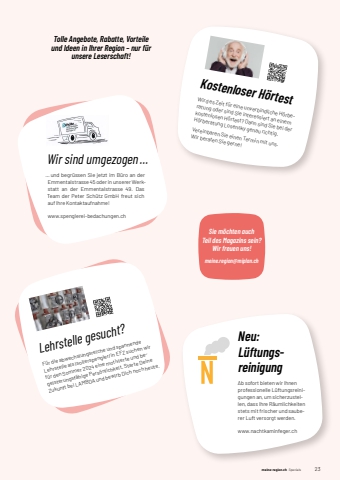 meine-region.ch Specials 23Regionale Specials f%u00fcr Sie1 meine-region.ch SpecialsVon A wie Augen%u00e4rztin bis Z wie Zimmermann %u2013 bleiben Sie sichtbar! meine.region@miplan.chFinden Sie Ihr neues Traumobjekt!Holzb%u00f6denentdeckenMit %u00fcber 150 B%u00f6den ist die B%u00e4rn-Parkett-Ausstellung in Ittigen eine der gr%u00f6ssten in der Region Bern. Bei einem Be,such im Showroom bekommen Sie eine individuelle und ga,rantiert pers%u00f6nliche Beratung. Schauen Sie vorbei!Gurnigel BergrennenDie Begeisterung f%u00fcr BMW und den Renn,sport ist der Auto Marti AG ins Gesicht geschrieben %u2013 nicht ohne Grund ist das Unternehmen seit vielen Jahren Partner am Gurnigel Bergrennen. Seien auch Sie n%u00e4chstes Jahr live mit dabei!Kommen Sie vorbei!Ob in geschlossenem Rahmen oder mit ausw%u00e4rtigen Besu,cherinnen und Besuchern %u2013 in regelm%u00e4ssigen Abst%u00e4nden l%u00e4dt das Alterszentrum Mattenhof zu bereichernden gemeinsamen Erlebnissen. Gartenkonzerte,Bilderpr%u00e4sentationen, Lebens,berichte und vieles mehr %u2013 das Programm ist vielseitig.www.jordi-liegenschaften.chVerkauf - Vermietung - Bewertungmeine-region.ch Specials 2Tolle Angebote, Rabatte, Vorteile und Ideen in Ihrer Region %u2013 nur f%u00fcr unsere Leserschaft! Sie m%u00f6chten auch Teil des Magazins sein?Wir freuen uns!meine.region@miplan.chNeu:L%u00fcftungsreinigungAb sofort bieten wir Ihnen professionelle L%u00fcftungsreinigungen an, um sicherzustellen, dass Ihre R%u00e4umlichkeiten stets mit frischer und sauberer Luft versorgt werden.www.nachtkaminfeger.chLehrstelle gesucht?F%u00fcr die abwechslungsreiche und spannende Lehrstelle als Isolierspengler/in EFZ suchen wir f%u00fcr den Sommer 2024 eine motivierte und begeisterungsf%u00e4hige Pers%u00f6nlichkeit. Starte Deine Zukunft bei LAMBDA und bewirb Dich noch heute.Wir sind umgezogen %u2026%u2026 und begr%u00fcssen Sie jetzt im B%u00fcro an der Emmentalstrasse 45 oder in unserer Werkstatt an der Emmentalstrasse 49. Das Team der Peter Sch%u00fctz GmbH freut sich auf Ihre Kontaktaufnahme!www.spenglerei-bedachungen.chKostenloser H%u00f6rtestWird es Zeit f%u00fcr eine unverbindliche H%u00f6rberatung oder sind Sie interessiert an einem kostenlosen H%u00f6rtest? Dann sind Sie bei der H%u00f6rberatung Losensky genau richtig. Vereinbaren Sie einen Termin mit uns. Wir beraten Sie gerne!