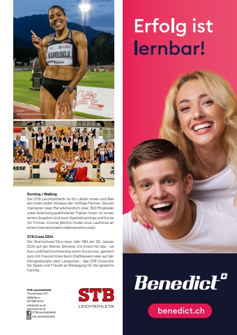 1 meine-region.ch Vereine meine-region.ch Vereine 29 STB Leichtathletik %u2013 der gr%u00f6sste Leichtathletik-Verein der SchweizMit rund 1000 Mitgliedern ist der STB Leichtathletik nicht nur der zahlenm%u00e4ssig gr%u00f6sste Leichtathletik,Verein der Schweiz, sondern dank des grossen Engagements vieler ehrenamtlicher Trainer:innen und Helfenden auch einer der erfolgreichsten. Obwohl sich hohe Mitgliederzahlen in so manchen Augen gut machen, z%u00e4hlt beim STB der Anspruch %u00abQualit%u00e4t vor Quantit%u00e4t%u00bb.Sowohl im Leistungssport als auch in der Nachwuchs,f%u00f6rderung geh%u00f6rt der STB Leichtathletik zur nationa,len Spitze. Im diesj%u00e4hrigen Vereinsranking von Swiss Athletics belegten wir erstmals den ersten Platz. Ein vielseitiger und erfolgreicher Breitensportbereich, der vor allem aus den Teilen Running und Walking besteht, rundet das vielf%u00e4ltige Angebot ab.Der STB steht f%u00fcr nationale Aush%u00e4ngeschilderKlingende Namen wie Markus Ryffel, Sandra Gasser, Werner G%u00fcnth%u00f6r und in den letzten Jahren die beiden Kambundji-Schwestern Mujinga und Ditaji sind das Resultat langj %u00e4hriger, professioneller Arbeit. Gegen,w%u00e4rtig befindet sich die Leichtathletik und nicht zu,letzt der STB wieder im Aufschwung. Unser Verein ist mehr als %u00abnur%u00bb Mujinga und Ditaji. Mit Judith Wy,der (Vize-Weltmeisterin im Short Trail 2023), Ram%u00f3n Wipfli (Silbermedaillengewinner an den U20 Europa,Quelle:Tobias Lackner / athletix.chmeisterschaften %u00fcber 800 m), Oksana Aeschbacher (Bronzemedaillengewinnerin mit der 4x400m Staffel an der Universiade in Chengdu) und vielen weiteren ist der STB bereit f%u00fcr die Zukunft.Auch wenn%u2019s mal nicht l%u00e4uft %u2026Nebst den sportlichen Erfolgen gab es auch diverse R%u00fcckschl%u00e4ge zu verkraften. Einerseits geh%u00f6rten die sportliche Krisenperiode der Schweizer Leichtathle,tik um das Jahr 2010 dazu, die mit der Heim-EM im Z%u00fcrcher Letzigrund 2014 in einen Aufschwung ver,wandelt werden konnte, andererseits die finanziellen Schwierigkeiten um die Jahrtausendwende. Diese konnten zum einen durch die Gr%u00fcndung des F%u00f6rder,vereins und zum anderen durch beispielhaften Zu,sammenhalt %u00fcberwunden werden.Der Einstieg %u2013 die LaufbahnKinder k%u00f6nnen bei uns mit f%u00fcnf Jahren ins Leicht,athletiktraining einsteigen. Zu Beginn stehen das Erwerben koordinativer Grundlagen und der Spass im Vordergrund. Anschliessend werden die Kinder und Jugendlichen Schritt f%u00fcr Schritt an den Leistungs,sport herangef%u00fchrt. Wer nicht den leistungsorientier,ten Weg einschlagen m%u00f6chte, kann ab 14 Jahren mit ersten Kursen im Bereich Trainingsleitung Fuss fassen oder in den Bereich Running/Breitensport wechseln.STB LeichtathletikThunstrasse 1073006 Bern031 382 51 52info@stb-la.chwww.stb-la.ch STBLeichtathletik stb_leichtathletikRunning / WalkingDer STB Leichtathletik ist f%u00fcr L%u00e4ufer:innen und Walker:innen jeden Niveaus der richtige Partner. Aktuell trainieren zwei Mal w%u00f6chentlich %u00fcber 300 Mitglieder unter Anleitung qualifizierter Trainer:innen. Im erweiterten Angebot sind auch Spezialtrainings und Kurse f%u00fcr Firmen. Einmal j%u00e4hrlich findet eine Laufreise an einen internationalen Halbmarathon statt.STB Cross 2024Der Startschuss f%u00fcrs neue Jahr f%u00e4llt am 20. Januar 2024 auf der Berner Allmend. Ein Event f%u00fcr alle %u2013 ob kurz und (fast) schmerzlos beim Kurzcross, gemeinsam mit Freund:innen beim Staffelevent oder auf der K%u00f6nigsdisziplin dem Langcross %u2013 das STB Cross bietet Spass und Freude an Bewegung f%u00fcr die gesamte Familie.Quelle:Ulf Schiller / athletix.chQuelle:%u0009ZVGInserat halbseitig, 101 x 297 mm