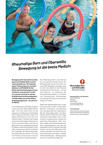 meine-region.ch meine-region.ch Vereine 31Rheumaliga Bern und Oberwallis Bewegung ist die beste MedizinBewegung wirkt sich positiv auf das psychische Wohlbefi nden und die Lebensqualit%u00e4t aus. Mit regelm%u00e4ssigem Training holen wir uns Kraft, Ausdauer und Mobilit%u00e4t f%u00fcr den Alltag. Sportliches Bewegen ist eine Investition in die Zukunft: Es hilft uns, gesund und fi t alt zu werden. Deshalb bietet die Rheumaliga Bern und Oberwallis eine breite Palette an Bewegungskursen %u2013 an Land und im Wasser.%u00abIch sch%u00e4tze das vielseitige Angebot %u2013 auch als Nicht-Rheumabetroffene%u00bb oder %u00abF%u00fcr mich steht nicht nur Bewegung im Vordergrund, die Geselligkeit ist genauso wichtig%u00bb: Diese und andere Zitate h%u00f6ren wir oft von Kursteilnehmenden. Training in der Gruppe und unter fachkundiger Anleitung motiviert und macht Spass, die Zeit vergeht wie im Flug. Egal ob beim AquaFit im Wasser oder beim Osteogym in der Halle %u2013 Bewegung tut K%u00f6rper und Seele gut. Mitglieder der Rheumaliga Bern und Oberwallis profi tieren von tieferen Preisen und kommen in den Genuss von weiteren Verg%u00fcnstigungen.Die Rheumaliga Bern und Oberwallis ist ein gemeinn%u00fctziger Verein, der 1935 gegr%u00fcndet wurde und heute von rund 2200 Mitgliedern getragen wird. Er setzt sich daf%u00fcr ein, den Gesundheitszustand von Menschen %u2013 mit und ohne Rheuma %u2013 zu verbessern, die Gesundheitskompetenz zu erh%u00f6hen und rheumatischen Erkrankungen vorzubeugen (Pr%u00e4vention) sowie deren Folgen zu mildern. Nebst den Bewegungskursen im ganzen Kanton Bern sowie im Oberwallis geh%u00f6ren Information und Beratung zum Kerngesch%u00e4ft der Organisation. Bei der Rheumaliga Bern und Oberwallis erfahren Menschen mit eingeschr%u00e4nkter Gesundheit durch medizinische, therapeutische, soziale und pr%u00e4ventive Massnahmen Hilfe. Zum Team z%u00e4hlen eine Physiotherapeutin, eine Ergotherapeutin und zwei Sozialarbeiterinnen. Es besteht die M%u00f6glichkeit, auf der Gesch%u00e4ftsstelle Hilfsmittel zu beziehen. Ein bunter Mix aus Veranstaltungen (Vortr%u00e4ge, Ausfl %u00fcge, Patientenbildungen, Bewegungswochen etc.) rundet das Angebot ab.Rheumaliga Bern und OberwallisHolzikofenweg 223007 Bern031 311 00 06 info.be@rheumaliga.chwww.rheumaliga.ch/beVeranstaltungenAktuelle%u0009Termine,%u0009alle%u0009Kurse%u0009sowie%u0009weitere Informationen entnehmen Sie%u0009bitte%u0009immer%u0009unserer%u0009Webseite.