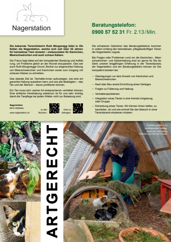 32 meine-region.ch VereineIn einem praktisch zu handhabenden Gehege macht die Tierhaltung Mensch und Tier viel Freude.ARTGERECHTDie bekannte Tiersch%u00fctzerin Ruth Morgenegg leitet in Obfelden die Nagerstation, welche sich seit %u00fcber 30 Jahren f%u00fcr heimatlose Tiere einsetzt %u2013 insbesondere f%u00fcr Kaninchen, Meerschweinchen und auch scheue Katzen. Der Fokus liegt dabei auf der kompetenten Beratung und Aufkl%u00e4rung, um Probleme gleich an der Wurzel anzupacken. Das war auch Ruth Morgeneggs Grund, B%u00fccher zur artgerechten Haltung von Meerschweinchen und Kaninchen sowie zum Umgang mit scheuen Katzen zu schreiben. Das oberste Ziel ist, Tierhalter:innen aufzuzeigen, wie eine artgerechte Haltung aussehen kann und wie alle Beteiligten %u2013 das Tier und der Mensch %u2013 davon profi tieren k%u00f6nnen. Ein Tier muss sich %u00abseiner Art entsprechend%u00bb verhalten k%u00f6nnen. Eine einfache Handhabung wiederum ist f%u00fcr uns sehr wichtig, damit die Tierpfl ege bei jedem Wetter nicht zur Belastung wird.Die erhobenen Geb%u00fchren des Beratungstelefons kommen in vollem Umfang den heimatlosen, pfl egebed%u00fcrftigen Tieren der Nagerstation zugute.Bei Fragen oder Problemen rund um die Kaninchen-, Meerschweinchen- und Katzenhaltung sind wir gerne f%u00fcr Sie da. Dank unserer langj%u00e4hrigen Erfahrung in der Tierarztpraxis, der Nagerstation und am Beratungstelefon k%u00f6nnen wir Sie kompetent beraten bei: %u2013 %u00dcberlegungen vor dem Erwerb von Kaninchen und Meerschweinchen %u2013 Kauf oder Bau sowie Einrichtung eines Geheges %u2013 Fragen zu F%u00fctterung und Haltung %u2013 Verhaltensproblemen %u2013 Integration eines Tieres in eine fremde Umgebung oder Gruppe %u2013 Erkrankung eines Tieres: Wir k%u00f6nnen Ihnen helfen, zu beurteilen, ob und wie schnell Sie den Besuch in einer Tierarztpraxis einplanen m%u00fcssen.Beratungstelefon:0900 57 52 31 Fr. 2.13 / Min. Nagerstation8912 Obfeldenwww.nagerstation.chzu den B%u00fcchern:Infos zu Gehegen:ARTGERECHTDie bekannte Tiersch%u00fctzerin Ruth Morgenegg leitet in Obfelden die Nagerstation, welche sich seit %u00fcber 30 Jahren f%u00fcr heimatlose Tiere einsetzt %u2013 insbesondere f%u00fcr Kaninchen, Meerschweinchen und auch scheue Katzen. Der Fokus liegt dabei auf der kompetenten Beratung und Aufkl%u00e4rung, um Probleme gleich an der Wurzel anzupacken. Das war auch Ruth Morgeneggs Grund, B%u00fccher zur artgerechten Haltung von Meerschweinchen und Kaninchen sowie zum Umgang mit scheuen Katzen zu schreiben. Das oberste Ziel ist, Tierhalter:innen aufzuzeigen, wie eine artgerechte Haltung aussehen kann und wie alle Beteiligten %u2013 das Tier und der Mensch %u2013 davon profi tieren k%u00f6nnen. Ein Tier muss sich %u00abseiner Art entsprechend%u00bb verhalten k%u00f6nnen. Eine einfache Handhabung wiederum ist f%u00fcr uns sehr wichtig, damit die Tierpfl ege bei jedem Wetter nicht zur Belastung wird.Die erhobenen Geb%u00fchren des Beratungstelefons kommen in vollem Umfang den heimatlosen, pfl egebed%u00fcrftigen Tieren der Nagerstation zugute.Bei Fragen oder Problemen rund um die Kaninchen-, Meerschweinchen- und Katzenhaltung sind wir gerne f%u00fcr Sie da. Dank unserer langj%u00e4hrigen Erfahrung in der Tierarztpraxis, der Nagerstation und am Beratungstelefon k%u00f6nnen wir Sie kompetent beraten bei: %u2013 %u00dcberlegungen vor dem Erwerb von Kaninchen und Meerschweinchen %u2013 Kauf oder Bau sowie Einrichtung eines Geheges %u2013 Fragen zu F%u00fctterung und Haltung %u2013 Verhaltensproblemen %u2013 Integration eines Tieres in eine fremde Umgebung oder Gruppe %u2013 Erkrankung eines Tieres: Wir k%u00f6nnen Ihnen helfen, zu beurteilen, ob und wie schnell Sie den Besuch in einer Tierarztpraxis einplanen m%u00fcssen.Beratungstelefon:0900 57 52 31 Fr. 2.13 / Min. Nagerstation8912 Obfeldenwww.nagerstation.chzu den B%u00fcchern:Infos zu Gehegen: