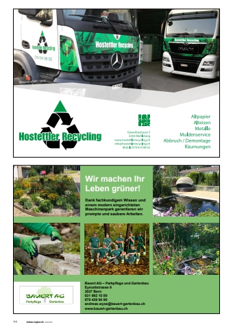 44 meine-region.ch Vereine meine-region.ch Vereine 1 M%u00e4nnerchor M%u00fchleberg %u2013Singen ist gesund und f%u00f6rdert die Kameradschaft!Der M%u00e4nnerchor M%u00fchleberg wurde im M%u00e4rz 1944 im Restaurant Traube M%u00fchleberg gegr%u00fcndet. Unter dem Motto %u00abPfl ege und F%u00f6rderung des Gesangs, Pfl ege des gesellschaftlichen Lebens und der Freundschaft%u00bb. Diese Grunds%u00e4tze stehen noch heute in den Statuten. Der M%u00e4nnerchor lebt diese vor 80 Jahren gefassten Grunds%u00e4tze bis heute treu nach. Die enge Verbindung zwischen Chor und Gasthof kommt nicht von ungef%u00e4hr. Eines der Gr%u00fcndungsmitglieder und Initiant war der ehemalige Traube-Wirt Gottfried Zingg. Der Chor probt einmal in der Woche am Donnerstagabend, von 20.15 bis 22.00 Uhr, im Saal des Hotels und Restaurants Traube. Die Proben werden nur durch die Sommerpause unterbrochen. Leider ist es wie in vielen Ch%u00f6ren ein Problem, Neus%u00e4nger zu fi nden. Die Hoffnung auf neue Mitglieder geben die Verantwortlichen aber nicht auf. Der M%u00e4nnerchor pfl egt ein attraktives Vereinsleben. Als H%u00f6hepunkt ist sicher der Unterhaltungsabend mit Liedervortr%u00e4gen und dem durch die eigene Theatergruppe aufgef%u00fchrten Theater zu erw%u00e4hnen. Zu den weiteren Vereinsaktivit%u00e4ten z%u00e4hlen auch der Maibummel, die Vereinsreise, Seniorenkonzert, Fondue-Plausch oder Treberwurstessen. Alle zwei Jahre f%u00fchrt der M%u00e4nnerchor das fast vergessene Spiel %u00abChneble%u00bb durch. An diesem Kampfspiel k%u00f6nnen sich Jung und Alt gegenseitig %u00abbek%u00e4mpfen%u00bb. 2024 werden wir solz unser 80-j%u00e4hriges Bestehen begehen. Wie schon an unserem 75-j%u00e4hrigen Jubil%u00e4um werden wir unter Mitwirkung befreundeter Ch%u00f6re, der Theatergruppe und Gastmusikern hoffentlich die zahlreich erscheinenden G%u00e4ste gut unterhalten.Wir suchen dringend Verst%u00e4rkung! S%u00e4nger und auch einen Dirigenten %u2013 der Pr%u00e4sident, Walter Jauner, oder unsere S%u00e4nger geben auch gerne pers%u00f6nlich Auskunft.M%u00e4nnerchor M%u00fchlebergWalter%u0009JaunerMurtenstrasse 153203 M%u00fchleberg031 751 04 89 / 079 651 33 89jauner@jaunerbedachungen.chwww.maennerchor-muehleberg.chVeranstaltungenAktuelle Termine entnehmen Sie bitte%u0009immer%u0009unserer%u0009Webseite.Wir machen Ihr Leben gr%u00fcner!Dank fachkundigem Wissen und einem modern eingerichteten Maschinenpark garantieren wir prompte und saubere Arbeiten.Bauert AG %u2013 Parkpfl ege und GartenbauEymattstrasse 93027 Bern031 992 15 00079 439 94 90andreas.wyss@bauert-gartenbau.chwww.bauert-gartenbau.ch