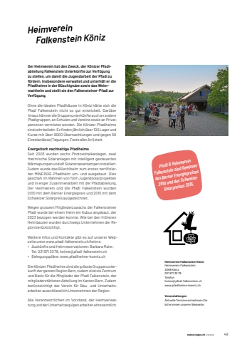 meine-region.ch meine-region.ch Vereine 491Heimverein Falkenstein K%u00f6nizDer Heimverein hat den Zweck, der K%u00f6nizer Pfadiabteilung Falkenstein Unterk%u00fcnfte zur Verf%u00fcgung zu stellen, um damit die Jugendarbeit der Pfadi zu f%u00f6rdern. Insbesondere verwaltet und unterh%u00e4lt er die Pfadiheime in der B%u00fcschigrube sowie das Weiermattheim und stellt sie den Falkensteiner-Pfadi zur Verf%u00fcgung.Ohne die idealen Pfadih%u00e4user in K%u00f6niz h%u00e4tte sich die Pfadi Falkenstein nicht so gut entwickelt. Dar%u00fcber hinaus k%u00f6nnen die Gruppenunterk%u00fcnfte auch an andere Pfadigruppen, an Schulen und Vereine sowie an Privatpersonen vermietet werden. Die K%u00f6nizer Pfadiheime sind sehr beliebt: Es fi nden j%u00e4hrlich %u00fcber 100 Lager und Kurse mit %u00fcber 9000 %u00dcbernachtungen und gegen 50 Einzelanl%u00e4sse (Tagungen, Feste aller Art) statt.Energetisch nachhaltige PfadiheimeSeit 2003 wurden sechs Photovoltaikanlagen, zwei thermische Solaranlagen mit intelligent gesteuerten W%u00e4rmepumpen und elf Solarstrassenlampen installiert. Zudem wurde das B%u00fcschiheim zum ersten zertifi zierten MINERGIE-Pfadiheim um- und ausgebaut. Dies geschah im Rahmen von f%u00fcnf Jugendsolarprojekten und in enger Zusammenarbeit mit der Pfadiabteilung. Der Heimverein und die Pfadi Falkenstein wurden 2010 mit dem Berner Energiepreis und 2015 mit dem Schweizer Solarpreis ausgezeichnet. Wegen grossem Mitgliederzuwachs der Falkensteiner Pfadi wurde bei einem Heim ein Kubus angebaut, der 2023 bezogen werden konnte. Wie bei den fr%u00fcheren Heimbauten wurden durchwegs Unternehmen der Region ber%u00fccksichtigt.Weitere Infos und Kontakte gibt es auf unserer Webseite unter www.pfadi-falkenstein.ch/heime. %u2022 Ausk%u00fcnfte und Heimreservationen: Barbara Maier, Tel. 031 971 30 78, heime@pfadi-falkenstein.ch%u2022 Belegungspl%u00e4ne: www.pfadiheime-koeniz.chDie K%u00f6nizer Pfadiheime sind die gr%u00f6sste Gruppenunterkunft der ganzen Region Bern, zudem sind sie Zentrum und Basis f%u00fcr die Mitglieder der Pfadi Falkenstein, der mitgliederst%u00e4rksten Abteilung im Kanton Bern. Zudem ber%u00fccksichtigt der Verein f%u00fcr Bau- und Unterhaltsarbeiten ausschliesslich Unternehmen der Region.Alle Verantwortlichen im Vorstand, der Heimverwaltung und der Unterhaltsequipen arbeiten ehrenamtlich.Heimverein Falkenstein K%u00f6nizHeimverein Falkenstein3098%u0009K%u00f6niz031 971 30 78Telefonheime@pfadi-falkenstein.chwww.pfadiheime-koeniz.chVeranstaltungenAktuelle Termine entnehmen Sie bitte%u0009immer%u0009unserer%u0009Webseite.Pfadi & Heimverein Falkenstein sind Gewinner des Berner Energiepreises 2010 und des Schweizer Solarpreises 2015.