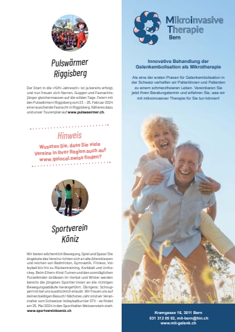 1 meine-region.ch Vereine meine-region.ch Vereine 53Freizeit und Freu (n) de Schlossverein FraubrunnenSave the date(s)!Schachklub K%u00f6niz-BubenbergSKEMA Kampfkunst OstermundigenJodlerklub K%u00f6nizb%u00e4rg K%u00f6nizIn Sachen Kleinkunst ist 2024 eine Menge los bei uns! Jede Menge tolle Auftritte von charismatischen K%u00fcnst,ler:innen: 12. Januar: %u00abmenze & schiwowa%u00bb, 2. Februar: %u00abFr%u00f6lein da Capo%u00bb, 24. April: %u00abEveline + Christa Brunner%u00bb, 14. Juni: %u00abUta K%u00f6bernick%u00bb, 13. September: %u00abKauder,welsch%u00bb, 18. Oktober: %u00abZauberer Lionel%u00bb, 15. November: %u00abKindertheater%u00bb, 13. Dezember: %u00abRenato Kaiser%u00bb. Aber auch in unserer Galerie und im Schlosskeller-Thea,ter ist etwas los %u2013 schauen Sie doch mal rein bei uns: www.schlosskellerfraubrunnen.chUnser Jodlerklub umfasst zur Zeit 13 singfreudige Mitglieder und wird von der bew%u00e4hrten Dirigentin und Komponistin Therese Aeberhard-H%u00e4usler aus Milken geleitet. Die Proben fi nden jeden Montag-Abend von 20.00 - 21.50 Uhr im Singsaal der Thomas Kirche in Liebefeld statt. Jede Person, die gerne mal schnup,pern und erfahren m%u00f6chte, ob ihr Jodelgesang gefallen k%u00f6nnte, ist bei uns herzlich willkommen. Die Kamerad,schaft und der gem%u00fctliche Ausklang nach der Probe ist uns ebenso wichtig, wie das Singen und Jutzen selbst. Wir nehmen regelm%u00e4ssig an den Jodlertreffen der Jodlervereinigung Sternenberg teil. Am Samstag, den 4. Mai 2024, fi ndet unser Fr%u00fchlingskonzert in der Aula des OSZ K%u00f6niz statt. www.jk-koenizbaerg.chRasant beginnt das Jahr f%u00fcr die Schachrecken des Schachklubs K%u00f6niz-Bubenberg. Spanndende Partien werden am 15. Januar beim Blitzturnier und am 22. Ja,nuar beim Rapidschach erwartet. Gem%u00fctlicher wird es in der 7. Runde des Vereinsturniers am 29. Januar. Wer hier weiter in die Materie eintauchen m%u00f6chte und die Turniere besuchen will, ist herzlich eingeladen.www.skkb.ch Wer sich in Form bringen m%u00f6chte, einfach Spass an ausbalancierter K%u00f6rperkoordination hat oder gern in Sachen Selbstverteildigung dazulernen m%u00f6chte, kann sich jederzeit f%u00fcr ein Schnuppertraining anmel,den. Wir bieten an: Energietraining Tai Chi & Qui Gong, Palakabanate Massagetraining, Kinder-Kung Fu, Ju,gend-Sebstverteildigung und Selbstverteidigung ab 16 Jahren. Wir freuen uns auf dich %u2013 kontaktiere uns un,verbindlich. www.skema.chmeine-region.ch Vereine 2Sportverein K%u00f6nizPulsw%u00e4rmer RiggisbergDer Start in die %u00abf%u00fcfti Jahreszit%u00bb ist ja bereits erfolgt, und nun freuen sich Narren, Guggen und Fasnachtsj%u00fcnger gleichermassen auf die wilden Tage. Feiert mit den Pulsw%u00e4rmern Riggisberg vom 23. - 25. Februar 2024 eine rauschende Fasnacht in Riggisberg. N%u00e4heres dazu und unser Tourenplan auf www.pulswaermer.ch.Wir bieten w%u00f6chentlich Bewegung, Spiel und Spass! Die Angebote des Vereins richten sich an alle Altersklassen und reichen von Badminton, Gymnastik, Fitness, Volleyball bis hin zu R%u00fcckentraining, Korbball und Unihockey. Beim Eltern-Kind-Turnen und den sonnt%u00e4glichen Purzelkinder-Anl%u00e4ssen im Herbst und Winter werden bereits die j%u00fcngsten Sportler:innen an die richtigen Bewegungsabl%u00e4ufe herangef%u00fchrt. %u00dcbrigens: Schnuppern ist bei uns ausdr%u00fccklich erlaubt. Wir freuen uns auf deinen baldigen Besuch! N%u00e4chstes Jahr sind wir Veranstalter vom Schweizer Volleyballturnier STV %u2013 es fi ndet am 25. Mai 2024 in den Sporthallen Weissenstein statt. www.sportvereinkoeniz.chHinweisWussten Sie, dass Sie vieleVereine in Ihrer Region auch aufwww.golocal.swiss fi nden?Inserat halbseitig, 101 x 297 mmKramgasse 16, 3011 Bern 031 312 05 02, mit-bern@hin.chwww.mit-gelenk.chInnovative Behandlung der Gelenkembolisation als MikrotherapieAls eine der ersten Praxen f%u00fcr Gelenkembolisation in der Schweiz verhelfen wir Patientinnen und Patienten zu einem schmerzfreieren Leben. Vereinbaren Sie jetzt Ihren Beratungstermin und erfahren Sie, was wir mit mikroinvasiver Therapie f%u00fcr Sie tun k%u00f6nnen!