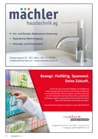 54 meine-region.ch Vereine meine-region.ch Vereine 1Volley K%u00f6niz %u2026 block, shock and rock.Der Verein Volley K%u00f6niz wurde 1970 als VBC K%u00f6niz gegr%u00fcndet und z%u00e4hlt mit 250 aktiven Spielerinnen zu den gr%u00f6ssten Volleyballclubs der Region. Die leistungssportorien,tierte Nachwuchsf%u00f6rderung steht bei Volley K%u00f6niz im Fokus und zahlt sich langfristig aus %u2013 so spielen im NLB-Eliteteam der laufenden Saison zahlreiche aktuelle und ehemalige Juniorinnen aus der eigenen Kader,schmiede.Volleyball ist eine technisch sehr an,forderungsreiche Sportart. Es werden alle koordinativen F%u00e4higkeiten ben%u00f6,tigt und im Training entsprechend gef%u00f6rdert. Nebst guter Athletik ist es wichtig, ein gutes Ballgef%u00fchl zu ent,wickeln und das Spiel zu verstehen. Wichtige Erfolgsfaktoren sind auch soziale Kompetenzen und ein ausge,zeichneter Teamspirit.Volley K%u00f6niz nimmt national an Meis,terschaften von Swiss Volley und regional von Swiss Volley Region Bern Solothurn teil. In den vergangenen Jahren etablierte sich Volley K%u00f6niz im Schweizer Volleyball-Nachwuchs aller Kategorien in den Top 8 und in den Top 6 der NLB. F%u00fcr Volley K%u00f6niz z%u00e4hlt aber nicht nur der Spitzen- und Leistungs,sportbereich mit aktuell f%u00fcnf Teams. Der Verein hat zudem vier Damen-, sechs Nachwuchs- sowie f%u00fcr die J%u00fcngsten zwei Einsteigerinnenteams im Breitensportbereich. W%u00e4hrend die Elite- und Leistungssportteams auch im Nachwuchs bereits vier- bis achtmal w%u00f6chentlich trainieren und/oder spielen, absolvieren die %u00fcbrigen Teams zwei Trainings pro Woche und spielen im Winterhalbjahr in der re,gionalen Meisterschaft. Neben dem sportlichen Erfolg stehen dabei der Spass und der Teamzusammenhalt im Vordergrund.Komm an unsere Heimspiele - wir freuen uns %u00fcber eine grosse Fange,meinde zur Unterst%u00fctzung unserer Teams! Weitere Informationen %u00fcber Volley K%u00f6niz, %u00fcber F%u00f6rderungsangebote f%u00fcr junge Talente und den Einstieg in den Volleyballsport fi ndest Du auf unserer Webseite unter www.volley-koeniz.ch.Volley K%u00f6nizWerkstrasse%u0009203084%u0009Waberninfo@volley-koeniz.chwww.volley-koeniz.ch%u0009%u0009%u0009%u0009%u0009%u0009%u0009%u0009%u0009volleykoeniz%u0009%u0009%u0009%u0009%u0009%u0009%u0009%u0009%u0009%u0009%u0009volley_koeniz%u0009%u0009%u0009%u0009%u0009%u0009%u0009%u0009%u0009%u0009Volley%u0009K%u00f6niz%u0009%u0009%u0009VeranstaltungenAktuelle Termine entnehmen Sie bitte%u0009immer%u0009unserer%u0009Webseite. Um- und Neubau Badezimmer-Sanierung Reparaturen Rohrreinigung Heizungs- und SolaranlagenGerberngasse 23 %u00b7 3011 Bern %u00b7 031 311 52 52info@maechler-bern.ch %u00b7 www.maechler-bern.ch Bewegt. Vielf%u00e4ltig. Spannend. Deine Zukunfi .Suchst Du eine sinnvolle T%u00e4tigkeit, die lebhafi und abwechslungsreich ist? Bist Du zuverl%u00e4ssig, einf%u00fchlsam und kontaktfreudig? Stehst Du gerne im direkten Kontakt mit der Kundschafi und freust Dich, Dein zunehmendes Fachwissen t%u00e4glich anzuwenden? Dann bereitet Dir dieser Beruf mit Sicherheit viel Freude und Spass.Gestalte Deine Zukunfi als Fachfrau/-mann Apotheke EFZL%u00e4nggassstrasse 28 %u00b7 3012 Bern %u00b7 031 301 23 22 laenggass.apotheke@ifak-hin.ch