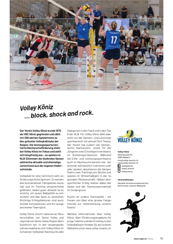 meine-region.ch meine-region.ch Vereine 551Volley K%u00f6niz %u2026 block, shock and rock.Der Verein Volley K%u00f6niz wurde 1970 als VBC K%u00f6niz gegr%u00fcndet und z%u00e4hlt mit 250 aktiven Spielerinnen zu den gr%u00f6ssten Volleyballclubs der Region. Die leistungssportorientierte Nachwuchsf%u00f6rderung steht bei Volley K%u00f6niz im Fokus und zahlt sich langfristig aus %u2013 so spielen im NLB-Eliteteam der laufenden Saison zahlreiche aktuelle und ehemalige Juniorinnen aus der eigenen Kaderschmiede.Volleyball ist eine technisch sehr anforderungsreiche Sportart. Es werden alle koordinativen F%u00e4higkeiten ben%u00f6tigt und im Training entsprechend gef%u00f6rdert. Nebst guter Athletik ist es wichtig, ein gutes Ballgef%u00fchl zu entwickeln und das Spiel zu verstehen. Wichtige Erfolgsfaktoren sind auch soziale Kompetenzen und ein ausgezeichneter Teamspirit.Volley K%u00f6niz nimmt national an Meisterschaften von Swiss Volley und regional von Swiss Volley Region Bern Solothurn teil. In den vergangenen Jahren etablierte sich Volley K%u00f6niz im Schweizer Volleyball-Nachwuchs aller Kategorien in den Top 8 und in den Top 6 der NLB. F%u00fcr Volley K%u00f6niz z%u00e4hlt aber nicht nur der Spitzen- und Leistungssportbereich mit aktuell f%u00fcnf Teams. Der Verein hat zudem vier Damen-, sechs Nachwuchs- sowie f%u00fcr die J%u00fcngsten zwei Einsteigerinnenteams im Breitensportbereich. W%u00e4hrend die Elite- und Leistungssportteams auch im Nachwuchs bereits vier- bis achtmal w%u00f6chentlich trainieren und/oder spielen, absolvieren die %u00fcbrigen Teams zwei Trainings pro Woche und spielen im Winterhalbjahr in der regionalen Meisterschaft. Neben dem sportlichen Erfolg stehen dabei der Spass und der Teamzusammenhalt im Vordergrund.Komm an unsere Heimspiele - wir freuen uns %u00fcber eine grosse Fangemeinde zur Unterst%u00fctzung unserer Teams! Weitere Informationen %u00fcber Volley K%u00f6niz, %u00fcber F%u00f6rderungsangebote f%u00fcr junge Talente und den Einstieg in den Volleyballsport fi ndest Du auf unserer Webseite unter www.volley-koeniz.ch.Volley K%u00f6nizWerkstrasse%u0009203084%u0009Waberninfo@volley-koeniz.chwww.volley-koeniz.ch%u0009%u0009%u0009%u0009%u0009%u0009%u0009%u0009%u0009volleykoeniz%u0009%u0009%u0009%u0009%u0009%u0009%u0009%u0009%u0009%u0009%u0009volley_koeniz%u0009%u0009%u0009%u0009%u0009%u0009%u0009%u0009%u0009%u0009Volley%u0009K%u00f6niz%u0009%u0009%u0009VeranstaltungenAktuelle Termine entnehmen Sie bitte%u0009immer%u0009unserer%u0009Webseite.