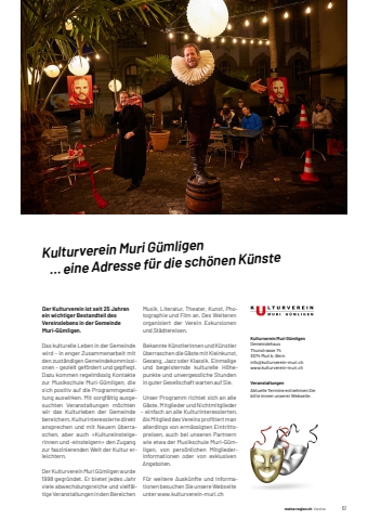 meine-region.ch meine-region.ch Vereine 61Kulturverein Muri G%u00fcmligen %u2026 eine Adresse f%u00fcr die sch%u00f6nen K%u00fcnsteDer Kulturverein ist seit 25 Jahren ein wichtiger Bestandteil des Vereinslebens in der Gemeinde Muri-G%u00fcmligen. Das kulturelle Leben in der Gemeinde wird %u2013 in enger Zusammenarbeit mit den zust%u00e4ndigen Gemeindekommissionen %u2013 gezielt gef%u00f6rdert und gepfl egt. Dazu kommen regelm%u00e4ssig Kontakte zur Musikschule Muri-G%u00fcmligen, die sich positiv auf die Programmgestaltung auswirken. Mit sorgf%u00e4ltig ausgesuchten Veranstaltungen m%u00f6chten wir das Kulturleben der Gemeinde bereichern, Kulturinteressierte direkt ansprechen und mit Neuem %u00fcberraschen, aber auch %u00abKultureinsteigerinnen und -einsteigern%u00bb den Zugang zur faszinierenden Welt der Kultur erleichtern. Der Kulturverein Muri G%u00fcmligen wurde 1998 gegr%u00fcndet. Er bietet jedes Jahr viele abwechslungsreiche und vielf%u00e4ltige Veranstaltungen in den Bereichen Musik, Literatur, Theater, Kunst, Photographie und Film an. Des Weiteren organisiert der Verein Exkursionen und St%u00e4dtereisen. Bekannte K%u00fcnstlerinnen und K%u00fcnstler %u00fcberraschen die G%u00e4ste mit Kleinkunst, Gesang, Jazz oder Klassik. Einmalige und begeisternde kulturelle H%u00f6hepunkte und unvergessliche Stunden in guter Gesellschaft warten auf Sie.Unser Programm richtet sich an alle G%u00e4ste, Mitglieder und Nichtmitglieder %u2013 einfach an alle Kulturinteressierten. Als Mitglied des Vereins profi tiert man allerdings von erm%u00e4ssigten Eintrittspreisen, auch bei unseren Partnern wie etwa der Musikschule Muri-G%u00fcmligen, von pers%u00f6nlichen Mitgliederinformationen oder von exklusiven Angeboten. F%u00fcr weitere Ausk%u00fcnfte und Informationen besuchen Sie unsere Webseite unter www.kulturverein-muri.chKulturverein Muri G%u00fcmligenGemeindehausThunstrasse 743074 Muri b. Berninfo@kulturverein-muri.chwww.kulturverein-muri.chVeranstaltungenAktuelle Termine entnehmen Sie bitte%u0009immer%u0009unserer%u0009Webseite.