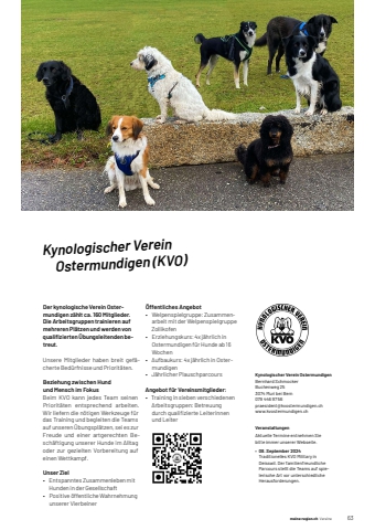 meine-region.ch meine-region.ch Vereine 631Kynologischer Verein Ostermundigen (KVO) Der kynologische Verein Ostermundigen z%u00e4hlt ca. 160 Mitglieder. Die Arbeitsgruppen trainieren auf mehreren Pl%u00e4tzen und werden von qualifi zierten %u00dcbungsleitenden betreut.Unsere Mitglieder haben breit gef%u00e4cherte Bed%u00fcrfnisse und Priorit%u00e4ten. Beziehung zwischen Hund und Mensch im Fokus Beim KVO kann jedes Team seinen Priorit%u00e4ten entsprechend arbeiten. Wir liefern die n%u00f6tigen Werkzeuge f%u00fcr das Training und begleiten die Teams auf unseren %u00dcbungspl%u00e4tzen, sei es zur Freude und einer artgerechten Besch%u00e4ftigung unserer Hunde im Alltag oder zur gezielten Vorbereitung auf einen Wettkampf.Unser Ziel%u2022 Entspanntes Zusammenleben mit Hunden in der Gesellschaft%u2022 Positive %u00f6ffentliche Wahrnehmung unserer Vierbeiner%u00d6ffentliches Angebot%u2022 Welpenspielgruppe: Zusammenarbeit mit der Welpenspielgruppe Zollikofen %u2022 Erziehungskurs: 4x j%u00e4hrlich in Ostermundigen f%u00fcr Hunde ab 16 Wochen%u2022 Aufbaukurs: 4x j%u00e4hrlich in Ostermundigen%u2022 J%u00e4hrlicher Plauschparcours Angebot f%u00fcr Vereinsmitglieder:%u2022 Training in sieben verschiedenen Arbeitsgruppen: Betreuung durch qualifi zierte Leiterinnen und Leiter Kynologischer Verein OstermundigenBernhard SchmockerBuchenweg 253074 Muri bei Bern079 446 97 56praesident@kvostermundigen.chwww.kvostermundigen.chVeranstaltungenAktuelle Termine entnehmen Sie bitte%u0009immer%u0009unserer%u0009Webseite.%u2022 08. September 2024Traditionelles%u0009KVO%u0009Military%u0009in%u0009Deisswil. Der familienfreundliche Parcours stellt die Teams auf spielerische Art vor unterschiedliche Herausforderungen.