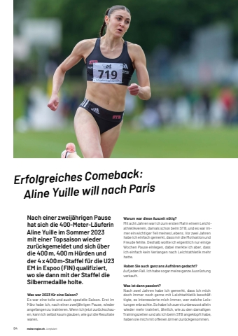 641 meine-region.ch meine-region.ch JungtalentErfolgreiches Comeback: Aline Yuille will nach ParisNach einer zweij %u00e4hrigen Pause hat sich die 400-Meter-L%u00e4uferin Aline Yuille im Sommer 2023 mit einer Topsaison wieder zur%u00fcckgemeldet und sich %u00fcber die 400 m, 400 m H%u00fcrden und der 4 x 400 m-Staffel f%u00fcr die U23 EM in Espoo (FIN) qualifi ziert, wo sie dann mit der Staffel die Silbermedaille holte. Was war 2023 f%u00fcr eine Saison?Es war eine tolle und auch spezielle Saison. Erst im M%u00e4rz habe ich, nach einer zweij %u00e4hrigen Pause, wieder angefangen zu trainieren. Wenn ich jetzt zur%u00fcckschauen, kann ich selbst kaum glauben, wie gut die Resultate waren. Warum war diese Auszeit n%u00f6tig?Mit acht Jahren war ich zum ersten Mal in einem Leichtathletikverein, damals schon beim STB, und es war immer ein wichtiger Teil meines Lebens. Vor zwei Jahren habe ich einfach gemerkt, dass mir die Motivation und Freude fehlte. Deshalb wollte ich eigentlich nur einige Wochen Pause einlegen, dabei merkte ich aber, dass ich einfach kein Verlangen nach Leichtathletik mehr hatte. Haben Sie auch ganz ans Aufh%u00f6ren gedacht?Auf jeden Fall. Ich habe sogar meine ganze Ausr%u00fcstung verkauft. Was ist dann passiert?Nach zwei Jahren habe ich gemerkt, dass ich mich doch immer noch gerne mit Leichtathletik besch%u00e4ftigte, es interessierte mich immer, wer welche Leistungen erbrachte. So habe ich zuerst unbewusst allein wieder mehr trainiert, %u00e4hnlich, wie zu den damaligen Trainingszeiten und als ich beim STB angeklopft habe, haben sie mich mit offenen Armen zur%u00fcckgenommen.
