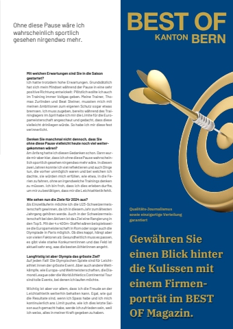 1 meine-region.ch Jungtalent meine-region.ch Vereine 65Erfolgreiches Comeback: Aline Yuille will nach ParisNach einer zweij %u00e4hrigen Pause hat sich die 400-Meter-L%u00e4uferin Aline Yuille im Sommer 2023 mit einer Topsaison wieder zur%u00fcckgemeldet und sich %u00fcber die 400 m, 400 m H%u00fcrden und der 4 x 400 m-Staffel f%u00fcr die U23 EM in Espoo (FIN) qualifi ziert, wo sie dann mit der Staffel die Silbermedaille holte. Was war 2023 f%u00fcr eine Saison?Es war eine tolle und auch spezielle Saison. Erst im M%u00e4rz habe ich, nach einer zweij %u00e4hrigen Pause, wieder angefangen zu trainieren. Wenn ich jetzt zur%u00fcckschau,en, kann ich selbst kaum glauben, wie gut die Resultate waren. Warum war diese Auszeit n%u00f6tig?Mit acht Jahren war ich zum ersten Mal in einem Leicht,athletikverein, damals schon beim STB, und es war im,mer ein wichtiger Teil meines Lebens. Vor zwei Jahren habe ich einfach gemerkt, dass mir die Motivation und Freude fehlte. Deshalb wollte ich eigentlich nur einige Wochen Pause einlegen, dabei merkte ich aber, dass ich einfach kein Verlangen nach Leichtathletik mehr hatte. Haben Sie auch ganz ans Aufh%u00f6ren gedacht?Auf jeden Fall. Ich habe sogar meine ganze Ausr%u00fcstung verkauft. Was ist dann passiert?Nach zwei Jahren habe ich gemerkt, dass ich mich doch immer noch gerne mit Leichtathletik besch%u00e4f,tigte, es interessierte mich immer, wer welche Leis,tungen erbrachte. So habe ich zuerst unbewusst allein wieder mehr trainiert, %u00e4hnlich, wie zu den damaligen Trainingszeiten und als ich beim STB angeklopft habe, haben sie mich mit offenen Armen zur%u00fcckgenommen. Ohne diese Pause w%u00e4re ich wahrscheinlich sportlich gesehen nirgendwo mehr. Mit welchen Erwartungen sind Sie in die Saison gestartet?Ich hatte trotzdem hohe Erwartungen. Grunds%u00e4tzlich hat sich mein Mindset w%u00e4hrend der Pause in eine sehr positive Richtung entwickelt: Pl%u00f6tzlich wollte ich auch im Training immer Vollgas geben. Meine Trainer, Thomas Zurlinden und Beat Steiner, mussten mich mit meinen Ambitionen zum eigenen Schutz sogar etwas bremsen. Ich muss zugeben, bereits w%u00e4hrend des Traininglagers im April habe ich mir die Limite f%u00fcr die Europameisterschaft angeschaut und gedacht, dass diese vielleicht drinliegen w%u00fcrde. So habe ich mir diese fest verinnerlicht.Denken Sie manchmal nicht dennoch, dass Sie ohne diese Pause vielleicht heute noch viel weitergekommen w%u00e4ren?Am Anfang hatte ich diesen Gedanken schon. Dann wurde mir aber klar, dass ich ohne diese Pause wahrscheinlich sportlich gesehen nirgendwo mehr w%u00e4re. In diesen zwei Jahren konnte ich viel refl ektieren und auch Dinge tun, die vorher unm%u00f6glich waren und bei welchen ich dachte, sie w%u00fcrden mich erf%u00fcllen, wie etwa, in die Ferien zu fahren, ohne an irgendwelche Trainings denken zu m%u00fcssen. Ich bin froh, dass ich dies erleben durfte, um mir zu best%u00e4tigen, dass mir die Leichtathletik fehlt.Wie sehen nun die Ziele f%u00fcr 2024 aus?Als Einzell%u00e4uferin m%u00f6chte ich die U23-Schweizermeisterschaft gewinnen, da ich in diesem Jahr zum %u00e4ltesten Jahrgang geh%u00f6ren werde. Auch in der Schweizermeisterschaft bei den Aktiven ist das Ziel eine Rangierung in den Top 5. Mit der 4 x 400m-Staffel w%u00e4ren beispielsweise die Europameisterschaft in Rom oder sogar auch die Olympiade in Paris m%u00f6glich. Ob dies kappt, h%u00e4ngt aber von vielen Faktoren ab: Gesundheitlich muss es passen, es gibt viele starke Konkurrentinnen und das Feld ist aktuell sehr eng, was die besten Athletinnen angeht. Langfristig ist aber Olympia das gr%u00f6sste Ziel? Auf jeden Fall! Die Olympischen Spiele sind f%u00fcr Leichtathlet:innen der gr%u00f6sste Event. Aber auch andere Wettk%u00e4mpfe, wie Europa- und Weltmeisterschaften, die Diamond League oder die World Athletics Continental Tour sind tolle Events, bei denen ich laufen m%u00f6chte. Wichtig ist aber vor allem, dass ich die Freude an der Leichtathletik weiterhin behalten kann. Egal, wie gut die Resultate sind, wenn ich Spass habe und ich mich kontinuierlich ans Limit pushe, wie ich dies letzte Saison auch gemacht habe, werde ich zufrieden sein, weil ich weiss, alles in meiner Kraft gegeben zu haben. Inserat halbseitig, 101 x 297 mmGew%u00e4hren Sie einen Blick hinter die Kulissen mit einem Firmenportr%u00e4t im BEST OF Magazin.BERNQualit%u00e4ts-Journalismus sowie einzigartige Verteilung garantiert