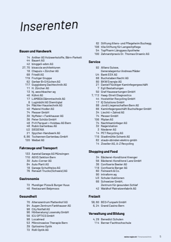 meine-region.ch Firmenverzeichnis 5Bauen und Handwerk%u0009 14%u0009 Anliker AG Holzwerkstoffe, B%u00e4rn-Parkett%u0009 44%u0009 Bauert AG%u0009 42%u0009 binggeli-wbm AG%u0009 27, 70%u0009 bisaccia architekturen%u0009 18%u0009 Chapuis + Z%u00fcrcher AG%u0009 68%u0009 Friedli AG%u0009 119%u0009 Frutiger Gruppe%u0009 62%u0009 Gerber B+S K%u00fcchen AG%u0009 117%u0009 Guggisberg Dachtechnik AG%u0009 11%u0009 H. Z%u00fcrcher AG%u0009 13%u0009 hj. aeschbacher ag%u0009 46%u0009 K%u00fchni AG%u0009 17%u0009 LAMBDA D%u00e4mmtechnik AG%u0009 8%u0009 Luginb%u00fchl AG Diemtigtal%u0009 54%u0009 M%u00e4chler Haustechnik AG%u0009 40%u0009 Malerei Hodler AG%u0009 74%u0009 Messer GmbH%u0009 30%u0009 Nyffeler + Fankhauser AG%u0009 36%u0009 Peter Sch%u00fctz GmbH%u0009 48%u0009 P+H Parquet + Holzbau AG Bern%u0009 48%u0009 Rubin Gartenbau AG%u0009 U2%u0009 SIEGENIA%u0009 21%u0009 Spycher-Handwerk AG%u0009 6, 86%u0009 Tschannen Gartenbau GmbH%u0009 120%u0009 Weibel AGFahrzeuge und Transport%u0009 133%u0009 Aaretal Garage AG M%u00fcnsingen%u0009 110%u0009 AGVS Sektion Bern%u0009 30%u0009 Auto-Corner AG%u0009 84%u0009 Auto Marti AG%u0009 18%u0009 Garage Schultheiss AG%u0009 76%u0009 Renault Trucks (Schweiz) AGGastronomie%u0009 72%u0009 Mundiger Pizza & Burger Huus%u0009 46%u0009 Restaurant BelpmoosGesundheit%u0009 70%u0009 Alterszentrum Mattenhof AG%u0009 94%u0009 Augen Zentrum Fankhauser AG%u0009 98%u0009 City Notfall AG%u0009 96%u0009 H%u00f6rberatung Losensky GmbH%u0009 56%u0009 ICU OPTICS GmbH%u0009 98%u0009 Localmed%u0009 53%u0009 Mikroinvasive Therapie Bern%u0009 39%u0009 Optissimo Optik%u0009 72%u0009 Rolli Optik AG%u0009 62%u0009 Stiftung Alters- und Pflegeheim Buchegg%u0009 108%u0009 tilia Stiftung f%u00fcr Langzeitpflege%u0009 54%u0009 TopPharm L%u00e4nggass Apotheke%u0009 100%u0009 Zahnarztpraxis Dr. Thomas Orsanic AGService%u0009 92%u0009 Allianz Suisse, Generalagentur Andreas M%u00e4der%u0009 U4%u0009 Bank EEK AG%u0009 68%u0009 Buchstaben Nacht AG%u0009 80%u0009 BKW Energie AG%u0009 21%u0009 Daniel Fl%u00fcckiger Kaminfegergesch%u00e4ft%u0009 7%u0009 Egli Bestattungen%u0009 50%u0009 Graf Hauswartungen GmbH%u0009 7, 112%u0009 Haag-Streit Diagnostics%u0009 44%u0009 Hostettler Recycling GmbH%u0009 17%u0009 IQ Solutions GmbH%u0009 88%u0009 Jordi Liegenschaften Bern AG%u0009 66%u0009 Kaminfegergesch%u00e4ft Buchsifeger GmbH%u0009 34%u0009 Liechti + Zahnd AG%u0009 74%u0009 Messer GmbH%u0009 106%u0009 Miplan AG%u0009 74%u0009 Nachtkaminfeger AG%u0009 32%u0009 Nagerstation%u0009 3%u0009 Niederer AG%u0009 14%u0009 PET Recycling AG%u0009 116%u0009 Stadtm%u00fchle Schenk AG%u0009 82%u0009 staub+zbinden elektro gmbh%u0009 14%u0009 Ziswiler AG, A-Z RecyclingShopping und Food%u0009 34%u0009 B%u00e4ckerei-Konditorei Krenger%u0009 56%u0009 B%u00e4ckerei-Konditorei Lanz GmbH%u0009 36%u0009 Confiserie Beeler AG%u0009 118%u0009 Confiserie Berger AG%u0009 60%u0009 Feinwerk & Co.%u0009 90%u0009 intraform ag%u0009 U3%u0009 Schuler Auktionen%u0009 66%u0009 Schweizer GmbH,%u0009 %u0009 Zentrum f%u00fcr gesunden Schlaf%u0009 42%u0009 Waldhof Matratzenfabrik AGFreizeit%u0009 58, 60%u0009 BEO-Funpark GmbH%u0009 6, 24%u0009 Grand Casino BernVerwaltung und Bildung%u0009 4, 29%u0009 Benedict Schulen%u0009 114%u0009 Berner FachhochschuleInserenten