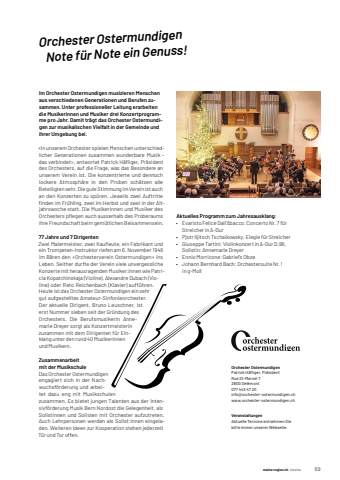 meine-region.ch meine-region.ch Vereine 691Orchester Ostermundigen Note f%u00fcr Note ein Genuss!Im Orchester Ostermundigen musizieren Menschen aus verschiedenen Generationen und Berufen zusammen. Unter professioneller Leitung erarbeiten die Musikerinnen und Musiker drei Konzertprogramme pro Jahr. Damit tr%u00e4gt das Orchester Ostermundigen zur musikalischen Vielfalt in der Gemeinde und ihrer Umgebung bei. %u00abIn unserem Orchester spielen Menschen unterschiedlicher Generationen zusammen wunderbare Musik %u2013 das verbindet%u00bb, antwortet Patrick H%u00e4fl iger, Pr%u00e4sident des Orchesters, auf die Frage, was das Besondere an unserem Verein ist. Die konzentrierte und dennoch lockere Atmosph%u00e4re in den Proben sch%u00e4tzen alle Beteiligten sehr. Die gute Stimmung im Verein ist auch an den Konzerten zu sp%u00fcren. Jeweils zwei Auftritte fi nden im Fr%u00fchling, zwei im Herbst und zwei in der Altjahrswoche statt. Die Musikerinnen und Musiker des Orchesters pfl egen auch ausserhalb des Proberaums ihre Freundschaft beim gem%u00fctlichen Beisammensein.77 Jahre und 7 DirigentenZwei Malermeister, zwei Kaufl eute, ein Fabrikant und ein Trompeten-Instruktor riefen am 6. November 1946 im B%u00e4ren den %u00abOrchesterverein Ostermundigen%u00bb ins Leben. Seither durfte der Verein viele unvergessliche Konzerte mit herausragenden Musiker:innen wie Patricia Kopatchinskaja (Violine), Alexandre Dubach (Violine) oder Reto Reichenbach (Klavier) auff%u00fchren. Heute ist das Orchester Ostermundigen ein sehr gut aufgestelltes Amateur-Sinfonieorchester. Der aktuelle Dirigent, Bruno Leuschner, ist erst Nummer sieben seit der Gr%u00fcndung des Orchesters. Die Berufsmusikerin Annemarie Dreyer sorgt als Konzertmeisterin zusammen mit dem Dirigenten f%u00fcr Einklang unter den rund 40 Musikerinnen und Musikern. Zusammenarbeit mit der MusikschuleDas Orchester Ostermundigen engagiert sich in der Nachwuchsf%u00f6rderung und arbeitet dazu eng mit Musikschulen zusammen. Es bietet jungen Talenten aus der Intensivf%u00f6rderung Musik Bern Nordost die Gelegenheit, als Solistinnen und Solisten mit Orchester aufzutreten. Auch Lehrpersonen werden als Solist:innen eingeladen. Weiteren Ideen zur Kooperation stehen jederzeit T%u00fcr und Tor offen.Orchester OstermundigenPatrick%u0009H%u00e4fl%u0009iger,%u0009Pr%u00e4sidentRue St-Marcel 72800 Del%u00e9mont077 443 47 20info@orchester-ostermundigen.chwww.orchester-ostermundigen.chVeranstaltungenAktuelle Termine entnehmen Sie bitte%u0009immer%u0009unserer%u0009Webseite.Aktuelles Programm zum Jahresausklang:%u2022 Evaristo Felice Dall'Abacco: Concerto Nr. 7 f%u00fcr Streicher in A-Dur%u2022 Pjotr Iljitsch Tschaikowsky: Elegie f%u00fcr Streicher%u2022 Giuseppe Tartini: Violinkonzert in A-Dur D.96, Solistin: Annemarie Dreyer%u2022 Ennio Morricone: Gabriel's Oboe%u2022 Johann Bernhard Bach: Orchestersuite Nr. 1 in g-Moll