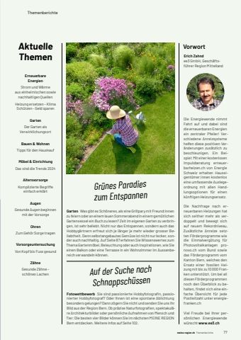 meine-region.ch meine-region.ch Themenberichte Einstiegsseiten 771ThemenberichteAktuelleThemenGarten Was gibt es Sch%u00f6neres, als eine Grillpary mit Freund:innen zu feiern oder an einem lauen Sommerabend in einem gem%u00fctlichen Gartensessel ein Buch zu lesen? Zeit im eigenen Garten zu verbringen, ist sehr beliebt. Nicht nur das Entspannen, sondern auch das Hobbyg%u00e4rtnern erfreut sich je l%u00e4nger je mehr wieder grosser Beliebtheit. Denn selbstangebautes Gem%u00fcse ist nicht nur lecker, sonder auch nachhaltig. Auf Seite 87 erfahren Sie Wissenswertes zum Thema Gartenm%u00f6bel, Beleuchtung oder auch Inspirationen, wie Sie einen Balkon oder eine Terrasse in ein Wohnzimmer im Aussenbereich verwandeln k%u00f6nnen. Erneuerbare EnergienStrom und W%u00e4rme aus einheimischen sowie nachhaltigen QuellenHeizung ersetzen %u2013 Klima Sch%u00fctzen - Geld sparenGartenDer Garten als VerwirklichungsortBauen & WohnenTipps f%u00fcr den HauskaufM%u00f6bel & EinrichtungDas sind die Trends 2024AltersvorsorgeKomplizierte Begriffe einfach erkl%u00e4rtAugenGesunde Augen beginnen mit der VorsorgeOhrenZum Geh%u00f6r Sorge tragenVorsorgeuntersuchungVon Kopf bis Fuss gesundZ%u00e4hneGesunde Z%u00e4hne %u2013 sch%u00f6nes LachenGr%u00fcnes Paradies zum EntspannenAuf der Suche nach Schnappsch%u00fcssenFotowettbewerb Sie sind passionierte Hobbyfotografi n, passionierter Hobbyfotograf? Oder Ihnen ist eine spontane Ablichtung besonders gelungen? Dann z%u00f6gern Sie nicht und senden Sie uns Ihr Bild aus der Region Bern. Ob pr%u00e4zise Naturfotografi en, spektakul%u00e4re Architekturbilder oder pers%u00f6nliche Aufnahmen von Mensch und Tier: Die besten vier Bilder k%u00f6nnen Sie im n%u00e4chsten MEINE REGION Bern entdecken. Weitere Infos auf Seite 102.VorwortErich Zahndee3 GmbH, Gesch%u00e4ftsf%u00fchrer Region MittellandDie Energiewende nimmt Fahrt auf und dabei sind die erneuerbaren Energien ein zentraler Pfeiler! Verschiedene Anreizsysteme helfen diese positiven Ver%u00e4nderungen zus%u00e4tzlich zu beschleunigen. Ein Beispiel: Mit einer kostenlosen Impulsberatung erneuerbarheizen.ch von Energie Schweiz erhalten Hauseigent%u00fcmer:innen kostenlos eine umfassende Auslegeordnung mit allen Handlungsoptionen f%u00fcr einen k%u00fcnftigen Heizungsersatz.Die Nachfrage nach erneuerbaren Heizungen hat sich seither mehr als verdoppelt und bewegt sich auf neuem Rekordniveau. Zus%u00e4tzliche Anreize setzten F%u00f6rderprogramme wie die Einmalverg%u00fctung f%u00fcr Photovoltaikanlagen pronovo.ch vom Bund sowie das F%u00f6rderprogramm vom Kanton Bern, welches den Ersatz einer fossilen Heizung mit bis zu 10 000 Franken unterst%u00fctzt. Um bei all diesen F%u00f6rderprogrammen noch den %u00dcberblick zu behalten, fi ndet sich eine einfache %u00dcbersicht f%u00fcr jede Postleitzahl unter energiefranken.chViel Freude bei Ihrer pers%u00f6nlichen Energiewende w%u00fcnscht www.ee3.chrenault-trucks.chWer im Transportgesch%u00e4ft die Zukunft mitgestalten will, kommt an einer CO2-neutralen Logistik nicht mehr vorbei. Im Rahmen der Dekarbonisierungsstrategie von Renault Trucks hat die kundenspezifische Ausrichtung oberste Priorit%u00e4t. Im Zentrum stehen die Bed%u00fcrfnisse und Anwendungsgebiete des Kunden: Ladeinfrastruktur, Reichweite und Nutzlast.Energie effizient eingesetztRT_Inserat_E-Tech_T_TIR-Transnews_210x297_230814.indd 1 14.08.23 14:35