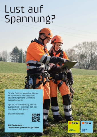 80 meine-region.ch ThemenberichteLust aufSpannung?F%u00fcr alle Outdoor-Menschen bieten wir spannende, vielseitige undabwechslungsreiche Stellen alsNetzelektriker:in.Egal ob als Grundbildung oder als Quereinstieg %u2013 informier dich hier oder bewirb dich gleich!bkw.ch/netzheldenMit Pioniergeist %u2013Lebensr%u00e4ume gemeinsam gestalten