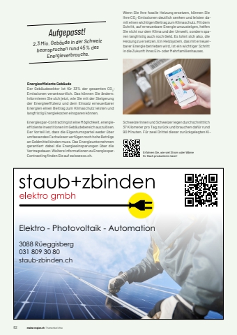 825 meine-region.ch meine-region.ch ThemenberichteEnergieeffi ziente Geb%u00e4udeDer Geb%u00e4udesektor ist f%u00fcr 33% der gesamten CO2-Emissionen verantwortlich. Das k%u00f6nnen Sie %u00e4ndern:Informieren Sie sich jetzt, wie Sie mit der Steigerung der Energieeffi zienz und dem Einsatz erneuerbarer Energien einen Beitrag zum Klimaschutz leisten und langfristig Energiekosten einsparen k%u00f6nnen. Energiespar-Contracting ist eine M%u00f6glichkeit, energieeffi ziente Investitionen im Geb%u00e4udebereich auszul%u00f6sen. Der Vorteil ist, dass die Eigentumspartei weder %u00fcber umfassendes Fachwissen verf%u00fcgen noch hohe Betr%u00e4ge an Geldmittel binden muss. Das Energieunternehmen garantiert dabei die Energieeinsparungen %u00fcber die Vertragsdauer. Weitere Informationen zu EnergiesparContracting fi nden Sie auf swissesco.ch.Wenn Sie Ihre fossile Heizung ersetzen, k%u00f6nnen Sie Ihre CO2-Emissionen deutlich senken und leisten damit einen wichtigen Beitrag zum Klimaschutz. Mit dem Schritt, auf erneuerbare Energie umzusteigen, helfen Sie nicht nur dem Klima und der Umwelt, sondern sparen langfristig auch noch Geld. Es lohnt sich also, die Heizung zu ersetzen. Ein Heizsystem, das mit erneuerbarer Energie betrieben wird, ist ein wichtiger Schritt in die Zukunft Ihres Ein- oder Mehrfamilienhauses.Schweizerinnen und Schweizer legen durchschnittlich 37 Kilometer pro Tag zur%u00fcck und brauchen daf%u00fcr rund 90 Minuten. F%u00fcr zwei Drittel dieser zur%u00fcckgelegten KiAufgepasst!2.3 Mio. Geb%u00e4ude in der Schweiz beanspruchen rund 45 % des Energieverbrauchs.Erfahren%u0009Sie,%u0009wie%u0009viel%u0009Strom%u0009oder%u0009W%u00e4me%u0009Ihr Dach produzieren kann!Inserat halbseitig, 186 x 134 mmElektro - Photovoltaik - Automation3088 R%u00fceggisberg031 809 30 80staub-zbinden.ch