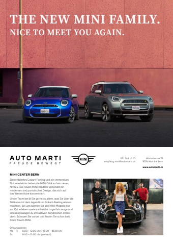 84 meine-region.ch Themenberichtefifffflffiflffl%u001affi%u0019%u0018fl%u0018ffi%u0017%u0016%u0019%u0018%u0015%u0014%u0013fl%u0018%u0012fflffifi%u0011ffi%u0019fflfflfiffi%u0014%u0011%u0010ffi%u0016%u000f%u0016%u0018fl%u0013MINI CENTER BERNElektrifi ziertes Gokart-Feeling und ein immersives Nutzererlebnis heben die MINI-DNA auf ein neues Niveau. Die neuen MINI-Modelle verbindet ein modernes und puristisches Design, das sich auf das Wesentliche konzentriert.Unser Team ber%u00e4t Sie gerne zu allem, was Sie %u00fcber die Stilikone mit dem legend%u00e4ren Gokart-Feeling wissen m%u00f6chten. Bei uns k%u00f6nnen Sie alle MINI-Modelle live vor Ort erleben sowie zahlreiche Lagerfahrzeuge und Occasionswagen zu attraktiven Konditionen entde,cken. Schauen Sie vorbei und fi nden Sie schon bald Ihren Traum-MINI.Worbstrasse 753074 Muri bei Bernwww.automarti.ch%u00d6ffnungszeiten:Mo %u2013 Fr 8.00 %u2013 12.00 Uhr / 13.00 %u2013 18.00 UhrSa 9.00 %u2013 13.00 Uhr (Verkauf)031 748 10 10empfang.mini@automarti.ch