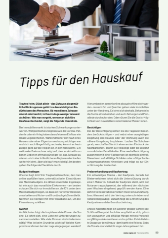 meine-region.ch meine-region.ch Themenberichte 891Tipps f%u00fcr den HauskaufTrautes Heim, Gl%u00fcck allein %u2013 das Zuhause als gem%u00fctliche R%u00fcckzugsoase geh%u00f6rt zu den wichtigsten Bed%u00fcrfnissen des Menschen. Ob man dieses Zuhause mietet oder besitzt, ist heutzutage weniger relevant als fr%u00fcher. Wie man vorgeht, wenn man sich f%u00fcrs Kaufen entscheidet, zeigt die folgende Checkliste.Der Immobilienmarkt ist starken Schwankungen unterworfen. Weltpolitische Ereignisse wie die Corona-Pandemie oder ein Krieg haben darauf ebenso Einfl uss wie lokale Gegebenheiten. W%u00e4hrend fr%u00fcher der Kauf eines Hauses oder einer Eigentumswohnung wichtiger war und sich auch l%u00e4ngerfristig rechnete, kommt es heutzutage ganz auf die Region an, in der man wohnt. Ein nationaler Preisrechner zeigt auf, dass es aktuell in urbanen Gebieten oftmals g%u00fcnstiger ist, das Zuhause zu mieten %u2013 sich aber in l%u00e4ndlicheren Regionen das Kaufen weiterhin lohnt. Aber wie kauft man richtig? Am besten gehen Sie folgende Checkliste durch:Budget festlegenWie viel liegt drin? Ein Tragbarkeitsrechner, den man online ausf%u00fcllen kann, unterst%u00fctzt beim Einsch%u00e4tzen des Maximalbudgets. Es z%u00e4hlen sowohl das Eigenkapital wie auch das monatliche Einkommen %u2013 am besten schauen Sie sich nur Immobilien an, die 10% unter dem Maximalbudget liegen, so dass ein Puffer f%u00fcr Renovationsarbeiten und Notar- und Grundbuchgeb%u00fchren bleibt. Nehmen Sie Kontakt mit Ihrer Hausbank auf, um die Finanzierung zu kl%u00e4ren.SuchenAls N%u00e4chstes folgt die inspirierendste Phase: die Suche! Es lohnt sich, eine Liste mit Anforderungen zusammenzustellen. Wie viele Zimmer sind mindestens n%u00f6tig? Was ist beim Grundriss wichtig? Welche Kompromisse k%u00f6nnen bei der Lage eingegangen werden? Hier am besten sowohl online als auch offl ine aktiv werden. Je nach Ort und Quartier gehen viele Immobilien unter der Hand weg. Es lohnt sich deshalb, Bekannte in die Suche einzubeziehen und auch Zeitungen und Pinnw%u00e4nde durchzuforsten. Oder n%u00fctzen Sie die Gratis-M%u00f6glichkeit von Newslettern verschiedener Makler:innen.BesichtigenBei der Besichtigung sollten Sie die Tageszeit besonders ber%u00fccksichtigen %u2013 und nebst einer ausgiebigen Begehung des Hauses oder der Wohnung auch die n%u00e4here Umgebung inspizieren. Laufen Sie Schulwege ab, verschaffen Sie sich einen ersten Eindruck der Nachbarschaft, pr%u00fcfen Sie Velowege oder die Distanz zum n%u00e4chsten Detailh%u00e4ndler. Eine zweite Besichtigung zusammen mit einer Fachperson ist ebenfalls sinnvoll. Diese kann auf allf%u00e4llige Sch%u00e4den oder n%u00f6tige Sanierungsmassnahmen hinweisen und tr%u00e4gt so zur Einsch%u00e4tzung der Kosten bei.Preisverhandlung und KaufvertragEin schwieriges Thema %u2013 der Kaufpreis. Gerade bei Bieterverfahren lohnt sich die Unterst%u00fctzung durch eine:n Makler:in. Sobald der Kaufpreis steht, wird der Notarvertrag aufgesetzt, der w%u00e4hrend der n%u00e4chsten zwei Wochen eingehend gepr%u00fcft werden kann. Eine defi nitive Reservation erfordert meist eine Anzahlung. Anschliessend wird der Vertrag unterschrieben und notariell beglaubigt. Danach folgt die Entrichtung des Kaufpreises und der Grundbucheintrag.Und als N%u00e4chstes folgt ein weiterer grosser Schritt: die Schl%u00fcssel%u00fcbergabe! Auch hier empfi ehlt es sich, gr%u00fcndlich vorzugehen und allf%u00e4llige M%u00e4ngel mittels Protokoll sorgf%u00e4ltig zu dokumentieren und zu pr%u00fcfen. Es ist die letzte Etappe vor dem Umzug %u2013 damit geht eine Reise zu Ende, die Monate oder vielleicht sogar Jahre gedauert hat.