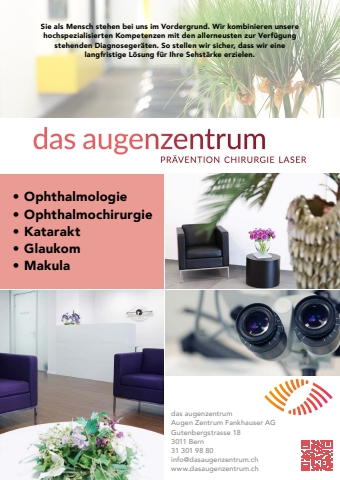 94 meine-region.ch InhaltSie als Mensch stehen bei uns im Vordergrund. Wir kombinieren unsere hochspezialisierten Kompetenzen mit den allerneusten zur Verf%u00fcgung stehenden Diagnoseger%u00e4ten. So stellen wir sicher, dass wir eine langfristige L%u00f6sung f%u00fcr Ihre Sehst%u00e4rke erzielen.%u2022 Ophthalmologie%u2022 Ophthalmochirurgie%u2022 Katarakt%u2022 Glaukom%u2022 Makuladas augenzentrumAugen Zentrum Fankhauser AGGutenbergstrasse 183011 Bern31 301 98 80 info@dasaugenzentrum.chwww.dasaugenzentrum.ch