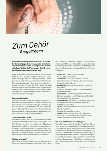 meine-region.ch meine-region.ch Themenberichte 971Zum Geh%u00f6r Sorge tragenDas Geh%u00f6r sch%u00fctzen, bevor es zu sp%u00e4t ist %u2013 aber wie? Der Ger%u00e4uschpegel, dem wir ausgesetzt sind, nimmt wegen technischer Ger%u00e4te und aufgrund des Verkehrs st%u00e4ndig zu. Wichtig sind Pausen, gute Kopf h%u00f6rer und ein H%u00f6rschutz, wenn es richtig laut wird.V%u00f6gel zwitschern, B%u00e4ume rauschen im Wind, die Armbanduhr tickt %u2013 allesamt sind dies relativ leise Ger%u00e4usche, die wir gut ertragen. F%u00e4hrt pl%u00f6tzlich ein Lastwagen vorbei, halten wir uns vielleicht unwillk%u00fcrlich die Ohren zu, aber es dauert nicht lange, und schon ist es wieder fast still. Solange die Ohren genug Ruhe bekommen, leisten sie treu ihren Dienst %u2013 bei extremen Schallspitzen oder bei einer l%u00e4ngeren, hohen L%u00e4rmbelastung k%u00f6nnen aber bleibende Sch%u00e4den auftreten. Es lohnt sich, diese vorzubeugen.Das menschliche OhrDas Ohr ist bei allen S%u00e4ugetieren %u00e4hnlich aufgebaut. Es besteht aus einem inneren und einem %u00e4usseren Ohr %u2013 letzteres ist dank der Ohrmuschel gut erkennbar. Ger%u00e4usche werden beim Menschen auf zwei Arten vom Aussen- %u00fcber das Mittel- bis ins Innenohr weitergeleitet, einerseits durch Luftschwingungen und andererseits durch Schwingung des Sch%u00e4delknochens. Zwei interessante FaktenWussten Sie, dass Ohren das ganze Leben lang weiter wachsen? Im Schnitt wachsen die Ohr muscheln etwa 0.2 Millimeter pro Jahr %u2013 es ist also keine T%u00e4uschung, dass die Ohren %u00e4lterer Menschen immer gr%u00f6sser erscheinen. Ebenso interessant ist die Tatsache, dass die Ohrmuschel fast genauso individuell ist wie der Fingerabdruck. Deshalb kann ein Ohrenabdruck durchaus dazu f%u00fchren, dass ein:e Straft%u00e4ter:in erwischt wird.Wie laut ist zu laut?Es ist wichtig zu wissen, dass nicht nur die Lautst%u00e4rke an sich sch%u00e4dlich sein kann, sondern auch die Dauer. Der L%u00e4rm einer Kettens%u00e4ge (%u00fcber 100 Dezibel) kann schon nach 15 Minuten H%u00f6rsch%u00e4den verursachen. Das Gleiche gilt f%u00fcr den Club und die Bar. Die folgende Liste gibt einen Eindruck %u00fcber die Lautst%u00e4rke verschiedener Ger%u00e4usche.%u2022 0 bis 20 dB %u2013 Atmen, leises Rauschen, Kaum h%u00f6rbare Ger%u00e4usche%u2022 20 bis 40 dB %u2013 das Ticken der Uhr, Fl%u00fcsternGut wahrnehmbare Ger%u00e4usche, die beim Einschlafen bereits st%u00f6ren k%u00f6nnen%u2022 40 bis 60 dB %u2013 Gespr%u00e4che, Hintergrundmusik aus dem RadioNormale Ger%u00e4usche, die die Konzentration beeintr%u00e4chtigen k%u00f6nnen%u2022 60 bis 80 dB %u2013 Telefonklingeln, StrassenverkehrAb einer Lautst%u00e4rke von 65 dB steigt das Risiko f%u00fcr Herz-Kreislauf-Erkrankungen%u2022 80 bis 100 dB %u2013 Lastwagen, Motors%u00e4ge, Rasenm%u00e4herBei langer Aussetzung sind ohne Geh%u00f6rschutz Sch%u00e4den unvermeidlich%u2022 110 dB %u2013 Presslufthammer, laute Musik im Club oder %u00fcber die Kopfh%u00f6rerUngesunder, sch%u00e4dlicher L%u00e4rm%u2022 120 dB %u2013 D%u00fcsenfl ugzeug beim Start, ExplosionL%u00e4rm, der zu Schmerzen in den Ohren und schon nach kurzer Zeit zu H%u00f6rsch%u00e4den f%u00fchrtWie kann man H%u00f6rsch%u00e4den vorbeugen?Wenn Sie regelm%u00e4ssig Musik %u00fcber Kopfh%u00f6rer h%u00f6ren, lohnt es sich, ein gutes Modell mit Ger%u00e4uschminimierung zu kaufen. Wenn Sie an ein lautes Konzert gehen oder berufl ich L%u00e4rm ausgesetzt sind, lohnt es sich, Ohrst%u00f6psel zu verwenden %u2013 am besten professionell, f%u00fcr die eigene Ohrmuschel geformte. Und das Wichtigste:G%u00f6nnen Sie Ihren Ohren regelm%u00e4ssig Pausen! Vielleicht mit einem Spaziergang im Wald? Denn wir wissen es ja nun %u2013 Bl%u00e4tterrauschen und Vogelzwitschern sind leise genug.Ihr pers%u00f6nliches H%u00f6rkonzept %u2013f%u00fcr mehr Lebensqualit%u00e4tGemeinsam erarbeiten wir in einem pers%u00f6nlichen Gespr%u00e4ch die perfekte L%u00f6sung f%u00fcr Ihr Geh%u00f6r %u2013 immer die neusten und modernsten H%u00f6rger%u00e4te aller Hersteller im Angebot zur unverbindlichen Ausprobe.W%u00e4re eine kompetente Beratung f%u00fcr Sie hilfreich?Nehmen Sie mit uns Kontakt auf. Wir freuen uns auf Sie!H%u00f6rberatung Losensky GmbH | Kreuzstrasse 2 | 3052 Zollikofen | 031 536 45 62 | hoerberatung@losensky.chKreuzstrasse 2 | 3052 ZollikofenA. LosenskyH%u00f6rberatung Losensky GmbHH%u00f6rkonzept