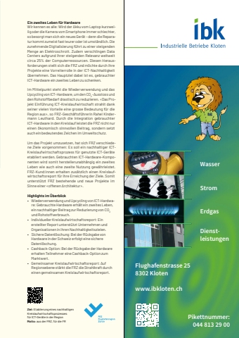1 meine-region.ch Gemeinden meine-region.ch Aus den Gemeinden 13 Vorreiterrollein Sachen NachhaltigkeitDie FRZ Flughafenregion Z%u00fcrich, Wirtschaftsnetzwerk und Standortentwicklung ebnet den Weg f%u00fcr eine nachhaltige digitale Zukunft durch die Einf%u00fchrung der ICT*-Kreislaufwirtschaft. Dieses wegweisende Projekt setzt auf die Wiederverwendung und das Upcycling von ICT-Hardware, um den CO2-Ausstoss und den Rohstoffbedarf zu reduzieren. In enger Zusammenarbeit mit Partnern realisiert die FRZ dieses Vorhaben, das in der Schweiz eine Vorreiter,rolle in Sachen Kreislaufwirtschaft einnimmt.*Informations- und KommunikationstechnologieDie Kreislaufwirtschaft zeichnet sich dadurch aus, dass Rohstoffe effi%u0009 %u0009 zient%u0009und%u0009so%u0009lange%u0009wie%u0009m%u00f6glich%u0009genutzt werden.Ein zweites Leben f%u00fcr HardwareWir kennen es alle: Wird der Akku vom Laptop kurzweilig oder die Kamera vom Smartphone immer schlechter, so besorgt man sich ein neues Ger%u00e4t %u2013 denn die Reparatur kommt zumeist fast teurer oder ist umst%u00e4ndlich. Die zunehmende Digitalisierung f%u00fchrt zu einer steigenden Menge an Elektroschrott. Zudem verschlingen Data Centers aufgrund ihrer steigenden Relevanz weltweit circa 25% der Computerressourcen. Diesen Herausforderungen stellt sich die FRZ und m%u00f6chte durch ihre Projekte eine Vorreiterrolle in der ICT-Nachhaltigkeit %u00fcbernehmen. Das Hauptziel dabei ist es, gebrauchter ICT-Hardware ein zweites Leben zu schenken.Im Mittelpunkt steht die Wiederverwendung und das Upcycling von ICT-Hardware, um den CO2-Ausstoss und den Rohstoffbedarf drastisch zu reduzieren. %u00abDas Projekt Einf%u00fchrung ICT-Kreislaufwirtschaft strahlt dank seiner vielen Vorteile eine grosse Bedeutung f%u00fcr die Region aus%u00bb, so FRZ-Gesch%u00e4ftsf%u00fchrerin Rahel Kindermann Leuthard. Durch die Integration gebrauchter ICT-Hardware in den Kreislauf leistet die FRZ nicht nur einen %u00f6konomisch sinnvollen Beitrag, sondern setzt auch ein bedeutendes Zeichen im Umweltschutz.Um das Projekt umzusetzen, hat sich FRZ verschiedene Ziele vorgenommen: Es soll ein nachhaltiger ICTKreislaufwirtschaftsprozess f%u00fcr genutzte ICT-Ger%u00e4te etabliert werden. Gebrauchten ICT-Hardware-Komponenten wird somit herstellerunabh%u00e4ngig ein zweites Leben wie auch eine zweite Nutzung gew%u00e4hrleistet. FRZ-Kund:innen erhalten zus%u00e4tzlich einen Kreislaufwirtschaftsreport f%u00fcr ihre Erreichung der Ziele. Somit unterst%u00fctzt FRZ bestehende und neue Projekte im Sinne einer %u00aboffenen Architektur%u00bb.Highlights im %u00dcberblick%u2022 Wiederverwendung und Upcycling von ICT-Hardware: Gebrauchte Hardware erh%u00e4lt ein zweites Leben, ein nachhaltiger Beitrag zur Reduzierung von CO2und Rohstoffverbrauch.%u2022 Individueller Kreislaufwirtschaftsreport: Ein erstellter Report unterst%u00fctzt Unternehmen und Organisationen in ihren Nachhaltigkeitszielen.%u2022 Sichere Datenl%u00f6schung: Bei der R%u00fcckgabe von Hardware in der Schweiz erfolgt eine sichere Datenl%u00f6schung.%u2022 Cashback-Option: Bei der R%u00fcckgabe der Hardware erhalten Teilnehmer eine Cashback-Option zum Marktwert.%u2022 Gemeinsamer Kreislaufwirtschaftsreport: Auf Regionsebene st%u00e4rkt die FRZ die Strahlkraft durch einen gemeinsamen Kreislaufwirtschaftsreport.Ziel: Etablierung eines nachhaltigen Kreislaufwirtschaftsprozesses f%u00fcr ICT-Ger%u00e4te in der RegionMotto:%u0009aus%u0009der%u0009FRZ,%u0009f%u00fcr%u0009die%u0009FRInserat halbseitig, 101 x 297 mmFlughafenstrasse 25 8302 Klotenwww.ibkloten.chPikettnummer: 044 813 29 00WasserStromErdgasDienstleistungen
