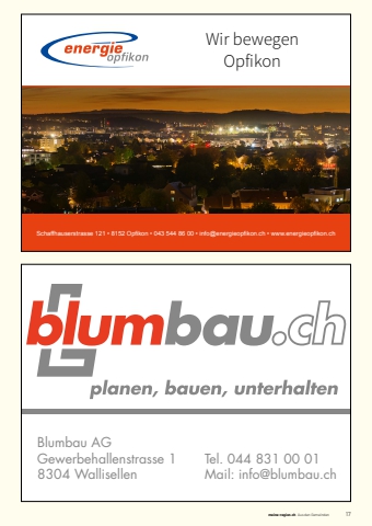 meine-region.ch Aus den Gemeinden 17Schaffhauserstrasse 121 %u2022 8152 Opfi kon %u2022 043 544 86 00 %u2022 info@energieopfi kon.ch %u2022 www.energieopfi kon.chWir bewegen OpfikonBlumbau AGGewerbehallenstrasse 18304 Wallisellen Mail: info@blumbau.chTel. 044 831 00 01