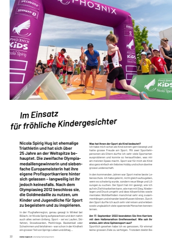 221 meine-region.ch meine-region.ch ehemalige Spitzensportlerin Im Einsatz f%u00fcr fr%u00f6hliche KindergesichterNicola Spirig Hug ist ehemalige Triathletin und hat sich %u00fcber 25%u00a0Jahre an der Weltspitze behauptet. Die zweifache Olympiamedaillengewinnerin und siebenfache Europameisterin hat ihre eigene Profi sportkarriere hinter sich gelassen %u2013 langweilig ist ihr jedoch keinesfalls. Nach dem Olympiasieg 2012 beschloss sie, die Goldmedaille zu nutzen, um Kinder und Jugendliche f%u00fcr Sport zu begeistern und zu inspirieren. In der Flughafenregion, genau gesagt in Winkel bei B%u00fclach, ist Nicola Spirig aufgewachsen und dort nahm auch alles seinen Anfang. Sport %u2013 sei es Laufen, Skifahren, Snowboarden, Meitliriege, Basketball oder Schwimmen und Velofahren %u2013 war schon in der Kindheit ein grosser Teil von Spirigs Leben und Alltag %u2026Was hat Ihnen der Sport als Kind bedeutet? Ich habe mich schon als Kind extrem gern bewegt und hatte grosse Freude am Sport. Mit zwei Sportlehrpersonen als Eltern durfte ich sehr viele Sportarten ausprobieren und konnte so herausfi nden, was mir am meisten Spass macht. Sport war f%u00fcr mich als Kind also ganz einfach ein liebstes Hobby und schon da eine grosse Leidenschaft.In den kommenden Jahren war Sport meine beste Lebensschule. Ich habe gelernt, nicht gleich aufzugeben, wenn es schwierig wurde, sondern neue Wege und L%u00f6sungen zu suchen. Der Sport hat mir gezeigt, wie ich auf ein Ziel hinarbeiten kann, wie man mit Sieg, Niederlagen und Druck umgeht und dass k%u00f6rperliches sowie mentales Wohlbefi nden manchmal sehr eng zusammenh%u00e4ngen und einander beeinfl ussen k%u00f6nnen. Durch den Sport durfte ich auch sehr viel reisen und erleben sowie unglaublich viele spannende Menschen kennenlernen. Am 17. September 2022 beendeten Sie Ihre Karriere mit dem Halbmarathon Greifenseelauf. Wie sah Ihr erstes Jahr ohne Spitzensport aus?Sportlich gesehen habe ich es genossen, f%u00fcr einmal keine grossen Ziele zu verfolgen. Trotzdem bleibt Be-