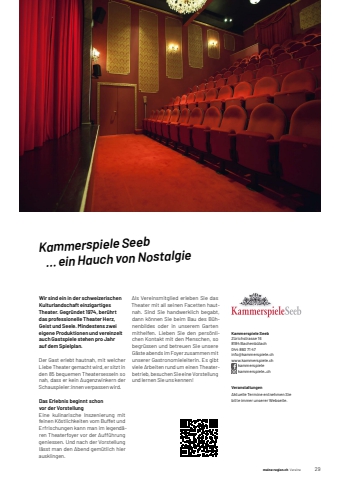 meine-region.ch meine-region.ch Vereine 291Kammerspiele Seeb %u2026 ein Hauch von NostalgieWir sind ein in der schweizerischen Kulturlandschaft einzigartiges Theater. Gegr%u00fcndet 1974, ber%u00fchrt das professionelle Theater Herz, Geist und Seele. Mindestens zwei eigene Produktionen und vereinzelt auch Gastspiele stehen pro Jahr auf dem Spielplan. Der Gast erlebt hautnah, mit welcher Liebe Theater gemacht wird, er sitzt in den 85 bequemen Theatersesseln so nah, dass er kein Augenzwinkern der Schauspieler:innen verpassen wird.Das Erlebnis beginnt schon vor der VorstellungEine kulinarische Inszenierung mit feinen K%u00f6stlichkeiten vom Buffet und Erfrischungen kann man im legend%u00e4ren Theaterfoyer vor der Auff%u00fchrung geniessen. Und nach der Vorstellung l%u00e4sst man den Abend gem%u00fctlich hier ausklingen.Als Vereinsmitglied erleben Sie das Theater mit all seinen Facetten hautnah. Sind Sie handwerklich begabt, dann k%u00f6nnen Sie beim Bau des B%u00fchnenbildes oder in unserem Garten mithelfen. Lieben Sie den pers%u00f6nlichen Kontakt mit den Menschen, so begr%u00fcssen und betreuen Sie unsere G%u00e4ste abends im Foyer zusammen mit unserer Gastronomieleiterin. Es gibt viele Arbeiten rund um einen Theaterbetrieb, besuchen Sie eine Vorstellung und lernen Sie uns kennen!Kammerspiele SeebZ%u00fcrichstrasse%u0009168184 Bachenb%u00fclach044 860 71 47info@kammerspiele.chwww.kammerspiele.ch kammerspiele kammerspiele_chVeranstaltungenAktuelle Termine entnehmen Sie bitte immer unserer Webseite.
