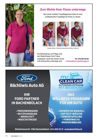 40 meine-region.ch VereineZum Wohle Ihrer F%u00fcsse unterwegsMit meiner mobilen Fusspfl egepraxis biete ich eine professionelle Fusspfl ege bei Ihnen zu Hause.Denise G%u00fcnes, Fachfrau Gesundheit und Dipl. PedicureDie Behandlung und Pfl ege wird den Bed%u00fcrfnissen Ihrer F%u00fcsse angepasst, damit Sie wieder sicher und schmerzfrei unterwegs sind.Tel. 079 583 65 85www.pedicure-glattbrugg.ch