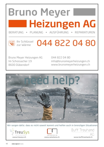 42 meine-region.ch VereineBeratung %u2022 Planung %u2022 ausf%u00fchrung %u2022 reParaturenIhr schl%u00fcssel zur W%u00e4rme 044 822 04 80BERATUNG PLANUNGAUSFUHRUNGREPARATURENIhr Schl%u00fcsselzur WarmeMWSt. Nr. CHE-106.801.424BMH_Brief_print_final.indd 1 1/27/15 2:17 PMBruno Meyer Heizungen A GIm Schossacher 198600 D%u00fcbendorfinfo@brunomeyerhei zungen.chwww.brunomeyerheizungen.ch044 822 04 80need help?Wir sorgen daf%u00fcr, dass es nicht soweit kommt und helfen auch in brenzligen Situationen.www.treusys.ch www.solutions.ch www.bufftreuhand.ch