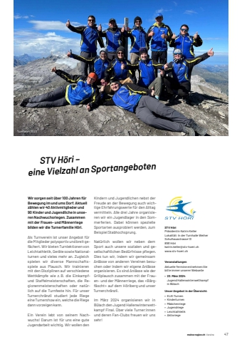 meine-region.ch meine-region.ch Vereine 471 STV H%u00f6ri %u2013eine Vielzahl an SportangebotenWir sorgen seit %u00fcber 100 Jahren f%u00fcr Bewegung im und ums Dorf. Aktuell z%u00e4hlen wir 40 Aktivmitglieder und 90%u00a0Kinder und Jugendliche in unseren Nachwuchsriegen. Zusammen mit der Frauen- und M%u00e4nnerriege bilden wir die Turnerfamilie H%u00f6ri. Als Turnverein ist unser Angebot f%u00fcr die Mitglieder polysportiv und breit gef%u00e4chert. Wir bieten Turnlektionen von Leichtathletik, Ger%u00e4te sowie Nationalturnen und vieles mehr an. Zugleich spielen wir diverse Mannschaftsspiele aus Plausch. Wir trainieren mit den Disziplinen auf verschiedene Wettk%u00e4mpfe wie z. B. die Einkampfund Staffelmeisterschaften, die Regionenmeisterschaften oder nat%u00fcrlich auf die Turnfeste hin. F%u00fcr unser Turnerchr%u00e4nzli studiert jede Riege eine Turnershow ein, welche die Riege dann vorzeigen kann.Ein Verein lebt von seinem Nachwuchs! Darum ist f%u00fcr uns eine gute Jugendarbeit wichtig. Wir wollen den Kindern und Jugendlichen nebst der Freude an der Bewegung auch wichtige Ehrfahrungswerte f%u00fcr den Alltag vermitteln. Alle drei Jahre organisieren wir ein Jugendlager in den Sommerferien. Dabei k%u00f6nnen spezielle Sportarten ausprobiert werden, zum Beispiel Stabhochsprung.Nat%u00fcrlich wollen wir neben dem Sport auch unsere sozialen und gesellschaftlichen Bed%u00fcrfnisse pfl egen. Dies tun wir, indem wir gemeinsam Anl%u00e4sse von anderen Vereinen besuchen oder indem wir eigene Anl%u00e4sse organisieren. Es sind Anl%u00e4sse wie der Grillplausch zusammen mit der Frauen- und der M%u00e4nnerriege, das %u00abB%u00e4rgf%u00e4scht%u00bb auf dem H%u00f6riberg und unser Turnerchr%u00e4nzli.Im M%u00e4rz 2024 organisieren wir in B%u00fclach den Jugend Hallenwinterwettkampf Final. %u00dcber viele Turner:innen und deren Fan-Clubs freuen wir uns sehr!STV H%u00f6riPr%u00e4sidentin Katrin KellerLokalit%u00e4t: In der Turnhalle Weiher Schulhausstrasse 138181%u0009H%u00f6rikatrin.keller@stv-hoeri.chwww.stv-hoeri.chVeranstaltungenAktuelle Termine entnehmen Sie bitte immer unserer Webseite%u2022 23. M%u00e4rz 2024Jugend Hallenwinterwettkampf in B%u00fclachUnser Angebot in der %u00dcbersicht:%u2022 ELKI Turnen%u2022 Kinderturnen %u2022 M%u00e4dchenriege %u2022 Jugendriege %u2022 Leichtathletik %u2022 Aktivriege Turnfahrt 2023