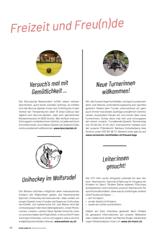 481 meine-region.ch meine-region.ch Agenda Voranzeigen VereineFreizeit und Freu (n) de Versuch's mal mitGem%u00fctlichkeit %u2026Leiter:innen gesucht!Neue Turnerinnen willkommen!Der Bocciaclub Bassersdorf erf%u00fcllt neben seinem sportlichen, auch einen sozialen Auftrag. So treffen sich die Boccia-Spieler:innen vom Fr%u00fchling bis in den Herbst bei Temperaturen %u00fcber 15 Grad Celsius fast t%u00e4glich zum Boccia-Spielen, oder zum gem%u00fctlichen Beisammensein im BCB-Grotto. Wer einfach mal zum Schnuppern vorbeikommen m%u00f6chte, ist jederzeit herzlich willkommen. Auch G%u00e4ste-Spieler von anderen Clubs sind uns jederzeit willkommen. www.bocciaclub.chWir, die Frauenriege Hochfelden, sind gern zusammen aktiv und ebenso unternehmungslustig wie sportbegeistert. Neben dem Turnen unternehmen wir gern auch immer mal wieder Ausfl %u00fcge und j%u00e4hrlich Vereinsreisen. Ausserdem freuen wir uns immer %u00fcber neue Turnerinnen. Schau doch mal rein und schnuppere bei einem unserer Turnabende (jeweils Donnerstag von 20.00 bis 21.45 Uhr). Interessierte melden sich bei unserer Pr%u00e4sidentin Barbara Schellenberg telefonisch unter 079 301 96 77. Weitere Infos gibt es auf www.turnverein-hochfelden.ch/frauenriegeDer STV H%u00f6ri sucht dringend Leitende f%u00fcr den Vereins- Nachwuchs. Sammle Erfahrung im Umgang mit Kindern im Sport, f%u00f6rdere Deine eigenen F%u00fchrungskompetenzen und motiviere unseren Nachwuchs f%u00fcr sportliche Aktivit%u00e4ten. Alles was Du mitbringen solltest sind Freude und Spass %u2026%u2022 am Turnsport%u2022 an der Arbeit mit Kindern %u2022 sowie am Leiten und Anleiten.Haben wir Dein Interesse geweckt dann fi ndest Du genauere Informationen auf unserer Webseite oder melde Dich direkt via Mail bei Roger Hiltebrand, roger.hiltebrand@stv-hoeri.ch. www.stv-hoeri.chUnihockey im WolfsrudelDie Wolves m%u00f6chten m%u00f6glichst allen interessierten Kindern die M%u00f6glichkeit geben, die faszinierende Sportart Unihockey kennenzulernen. Dazu wollen wir jungen Spieler:innen Freude und Spass am Unihockey vermitteln. Auf spielerische Art und Weise wird der Unihockeysport den Kids n%u00e4hergebracht. Unser Motto:Lernen, Leisten, Lachen! Neue Spieler:innen f%u00fcr unsere Junioren haben die M%u00f6glichkeit, in bis zu f%u00fcnf Probetrainings Unihockey-Luft zu schnuppern, bevor sie sich endg%u00fcltig entscheiden m%u00fcssen. www.wolves-zu.ch